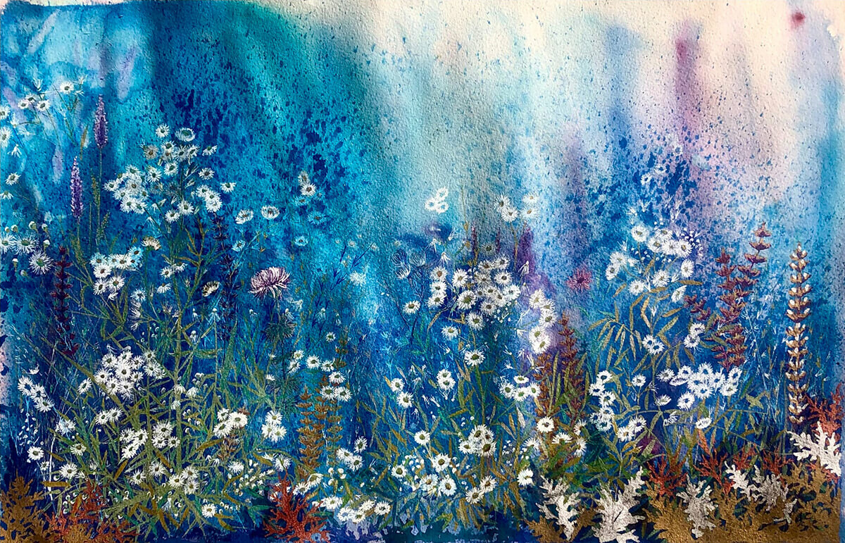 Η καλλιτέχνης εστιάζει όχι μόνο στο να αποδώσει την ομορφιά του φυσικού τοπίου αλλά και στο να δημιουργήσει έναν διάλογο μεταξύ της φύσης και της ανθρώπινης ψυχής. Τα έργα της λειτουργούν σαν ένας καθρέφτης που αντανακλά το εσωτερικό τοπίο του θεατή, υπενθυμίζοντάς μας τη βαθιά σχέση μας με το φυσικό περιβάλλον. Η αίσθηση του αέρα που διαπερνά τη βλάστηση, τα σχήματα που αγγίζουν την αφαίρεση και οι λεπταίσθητες αποχρώσεις που φωτίζουν το χαρτί, μας καλούν να αναλογιστούμε τη δική μας θέση μέσα στον κόσμο και την αναπόφευκτη σύνδεσή μας με τον κύκλο της ζωής και του θανάτου.