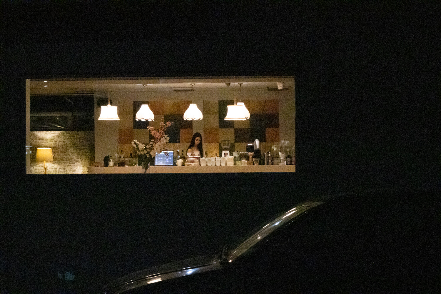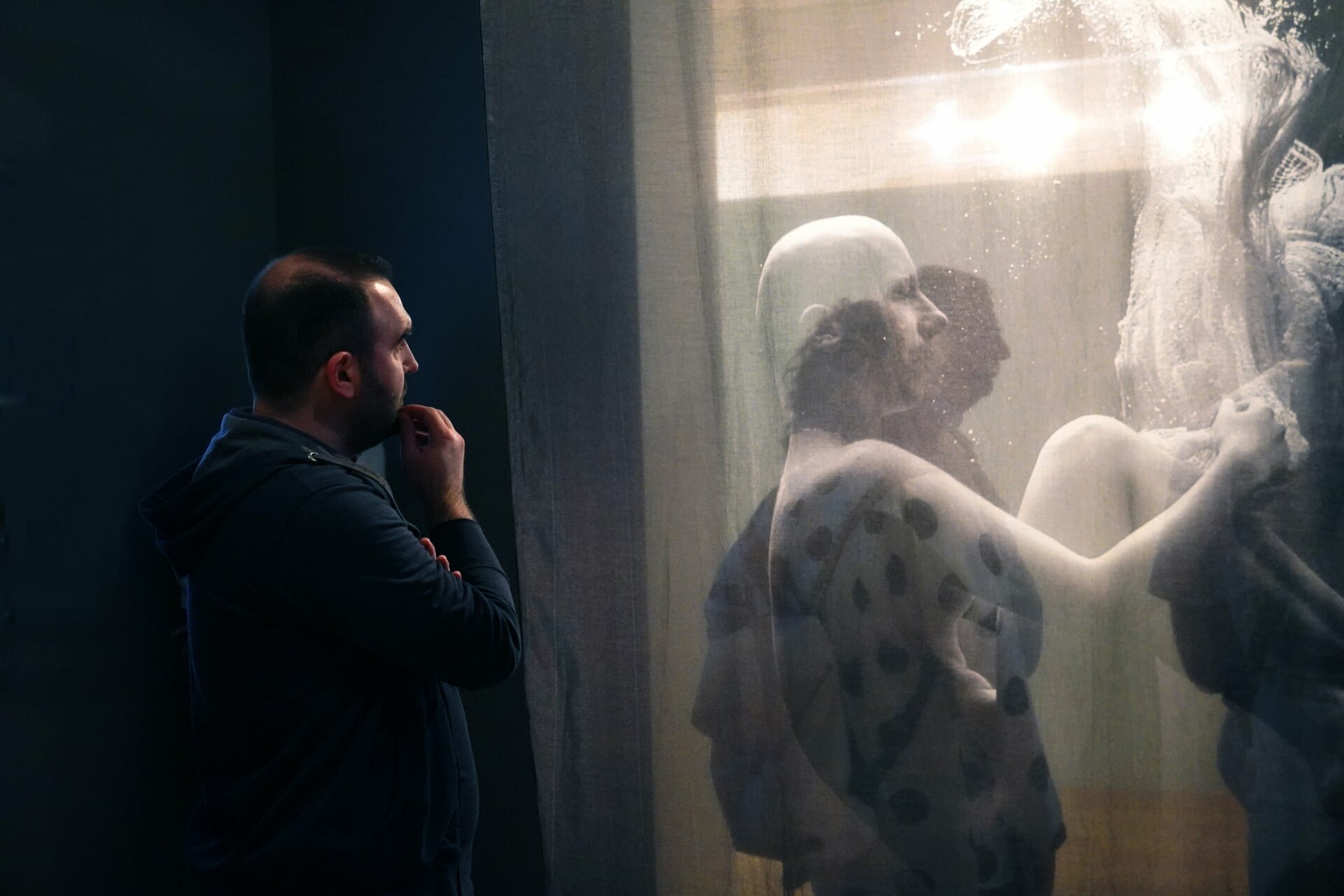 Η έκθεση ξεδιπλώνεται μέσα από εικόνες ανθρώπων που συγχρονίζονται κάτω από βροχή, βλεμμάτων που διασταυρώνονται πίσω από τζάμια, εσωτερικούς χώρους κτηρίων με γεωμετρία και αίσθηση αναμονής, επιγραφές και αφίσες που φωνάζουν σε τοίχους βουβούς, απομονωμένα πρόσωπα, φώτα των δρόμων και των καταστημάτων που μετατρέπουν τη νύχτα σε παράσταση, σκηνές καθημερινότητας, σημεία που δεν προορίζονταν να είναι όμορφα, κι όμως, είναι.