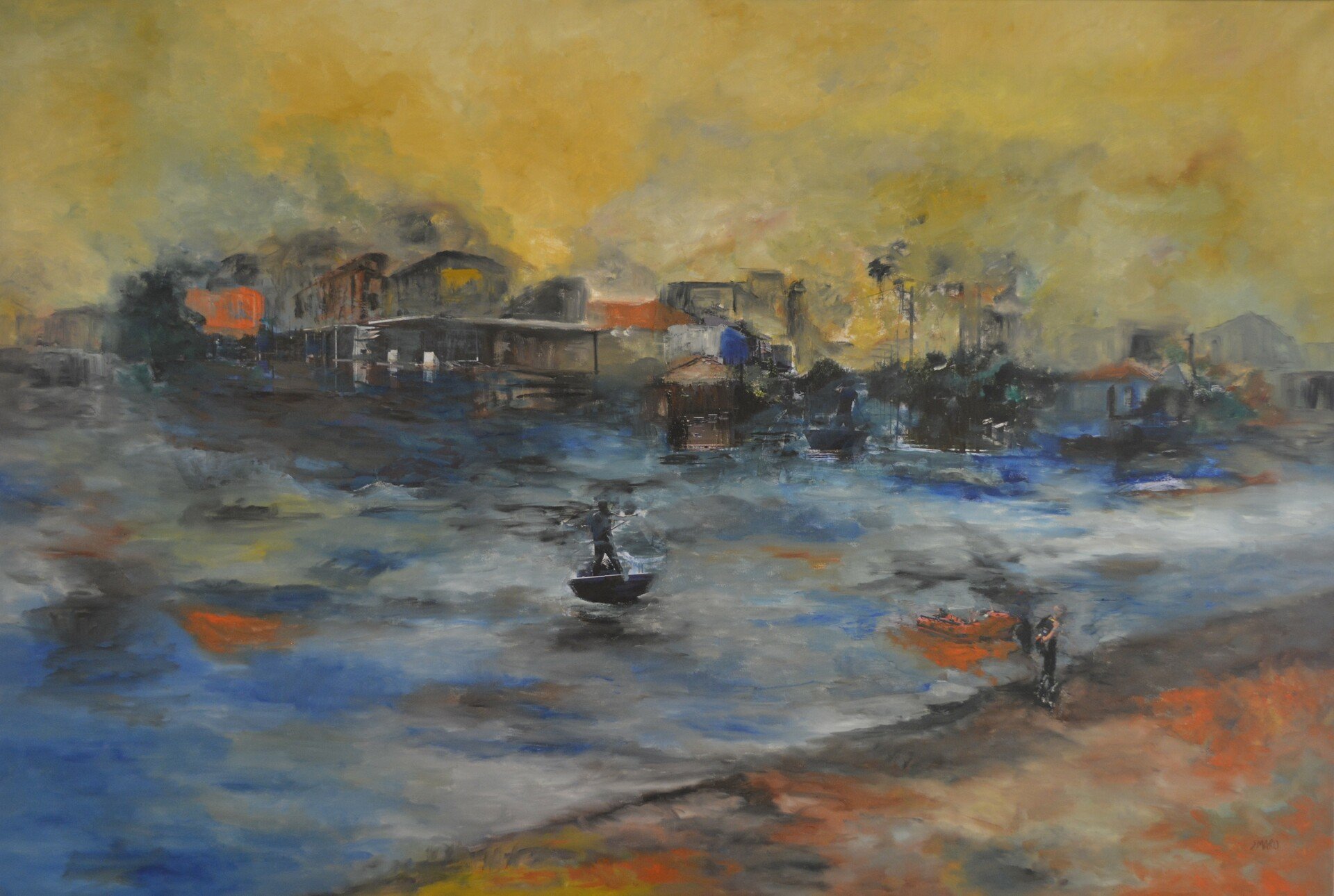 Εργαζόμενη με τρόπο κατοπτρικό και ανασκαπτικό, η Σμαρώ Τζενανίδου μας αποκαλύπτει έναν δυστοπικό κόσμο, που αρθρώνεται με γλαφυρή ζωγραφική δεξιότητα και ζοφερή μαεστρία. Ιμπρεσιονιστικά φάσματα στιγμιαίου αποτυπωμένου χρώματος, χροιές ένσαρκες βιωμένου τόπου και χρόνου, μεταβατική διάφανη ύλη νερού που απλώνεται καλειδοσκοπικά, αρθρώνοντας αθόρυβα διαδοχικές συντμήσεις ολέθρου, σκιές πόλεων και διαγράμματα γερασμένων κτηρίων. Ιχνηλατήσεις ανθρώπινης παρουσίας σε βίαιη μετακίνηση, συμβάντα αθέατα στη μεγάλη εικόνα της ιστορίας, καθρεφτίζονται εδώ σε στροβιλική ή εγκάρσια ροή, διεκδικώντας το βλέμμα. Διεκδικώντας το βλέμμα για τους περισσότερους από διακόσια εκατομμύρια «Αόρατους της Γης», τους κλιματικούς πρόσφυγες (climate refugees) που παραμένουν ανέστιοι τα τελευταία δέκα περίπου χρόνια και ταυτόχρονα μη αναγνωρισμένοι και μη ενταγμένοι σε νομικό πλαίσιο από τη διεθνή κοινότητα, υφιστάμενοι αναρίθμητες και αδιέξοδες κοινωνικές και οικονομικές πιέσεις.