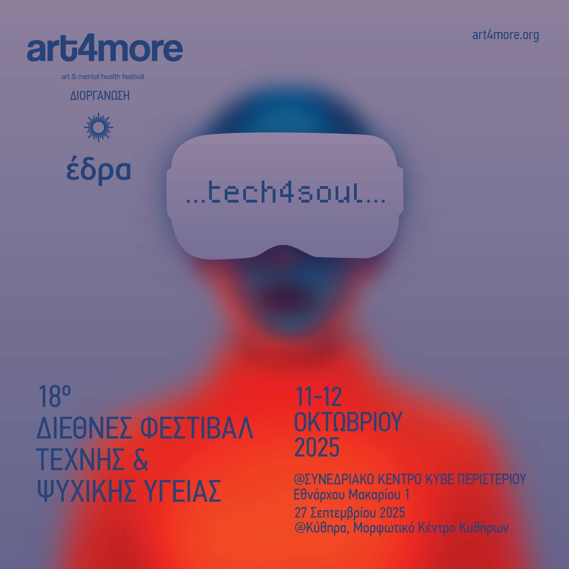 Tο ART4MORE 2025 “Tech4Soul”, με τη συμμετοχή καλλιτεχνών, ειδικών της ψυχικής υγείας και της τεχνολογίας, σας καλεί να ζήσετε μια μοναδική εμπειρία που αναδεικνύει τη δύναμη της τέχνης και της τεχνολογίας ως εργαλεία έκφρασης δημιουργικότητας και ψυχικής ευεξίας.