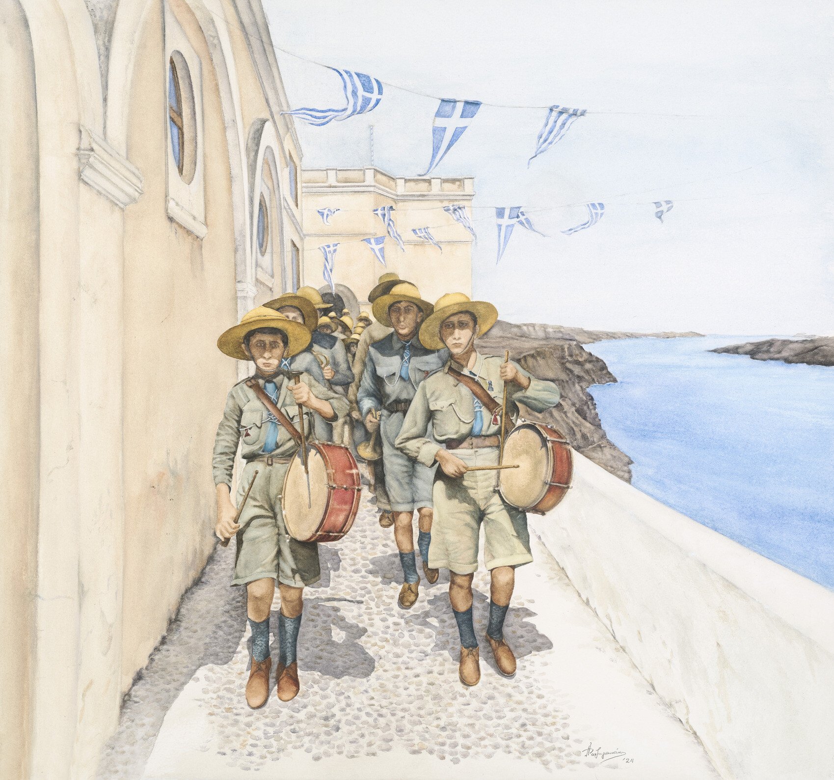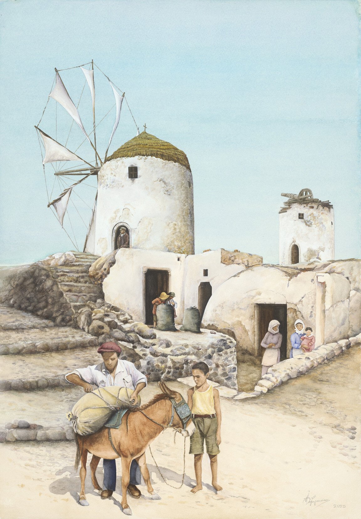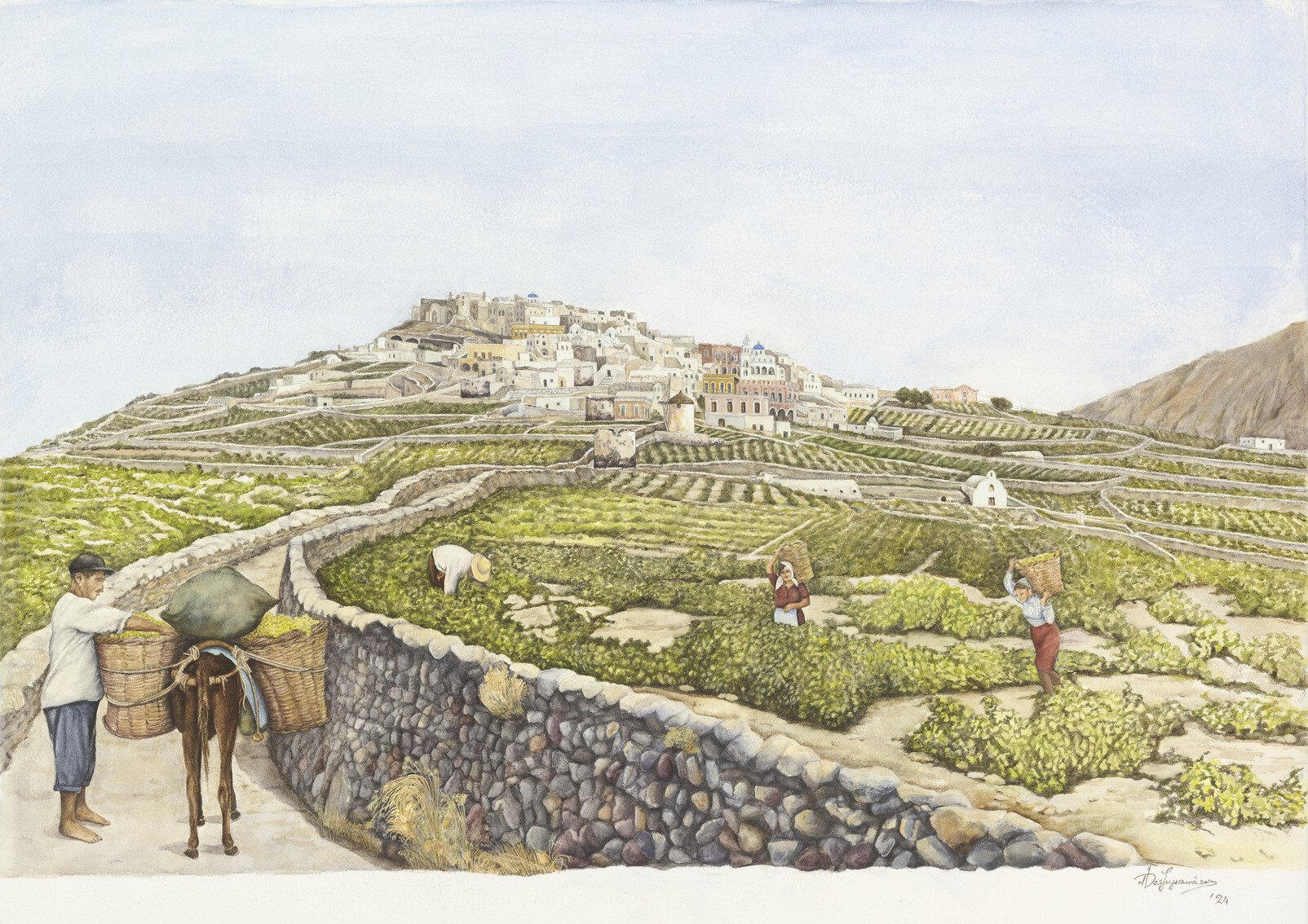 Ορίζοντας ένα νέο βλέμμα στις αθέατες αλλά ενεργές πολιτισμικές καταβολές της Σαντορίνης, η Άρτεμις Χατζηγιαννάκη παρουσιάζει δέκα πέντε νέα έργα (όλα υδατογραφίες) αρμολογημένα σε ένα ιστορικό αφήγημα μέσα από τους τελετουργικούς κύκλους της παράδοσης, των κύκλων εργασίας, της τοπικής οικονομίας, των εθίμων και του συλλογικού θυμικού. Ο επισκέπτης θα αναγνωρίσει πτυχές μιας Σαντορίνης που επιβιώνει όχι μόνο στη μνήμη και στην προφορική μαρτυρία, αλλά και στο ανάγλυφο του τοπίου, στην αρχαία γη, στην γραμμή του ορίζοντα, στην παράδοση της αμπέλου και του οίνου, στα γεωργικά προϊόντα, στη χλωρίδα και στους κύκλους του χρόνου, στην αρχιτεκτονική, που διατρέχει τη στερεότυπη εικόνα της Σαντορίνης μέσα από εκλάμψεις αυθεντικότητας και αρχέγονης σοφίας. Στην έκθεση παρουσιάζονται επίσης και τέσσερα παλαιότερα έργα της εικαστικού με θεματική συνάφεια, εμπνευσμένα από τις τοιχογραφίες του Προϊστορικού Οικισμού του Ακρωτηρίου, που υποδηλώνουν την αρχέγονη εξάρτηση του ανθρώπου από τα στοιχεία της φύσης και τους τελετουργικούς κύκλους της (σκηνές του φυτικού και ζωικού βασιλείου με θαλασσόκρινους, κυανοπιθήκους, αντιλόπες).