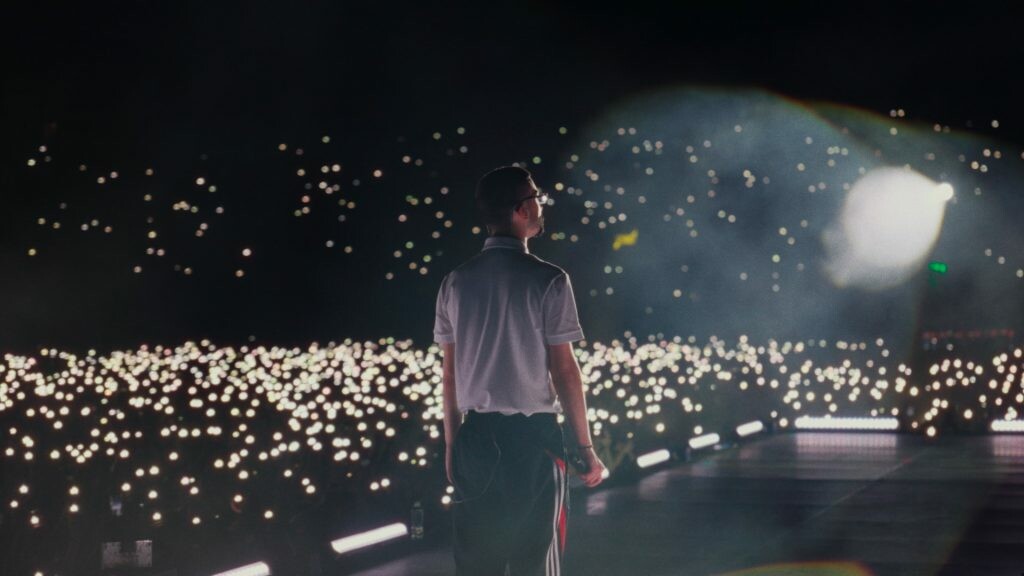 Και όντως, αυτό που θα δούμε στη συνέχεια έχει τη δομή μιας αθλητικής ταινίας. Ακολουθεί το δοκιμασμένο μοτίβο του underdog story με έναν χαρακτήρα λιπόσαρκο, ταπεινών καταβολών, σχεδόν ακατάλληλο στην όψη και τη συμπεριφορά για το «άθλημά» του, που καταφέρνει σταδιακά να κατακτήσει την κορυφή. Παράλληλα, παρακολουθούμε σκηνές από τη μεγάλη περιοδεία του καλλιτέχνη το 2024, μέσα στις οποίες χτίζεται ένα (σχετικό) σασπένς γύρω από μια μεγάλη, δωρεάν συναυλία στη γενέτειρά του, την Ξάνθη.