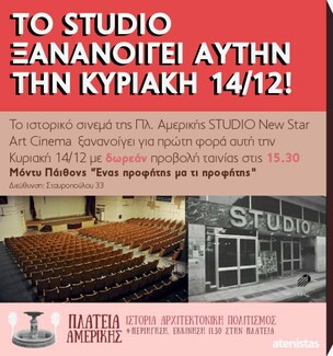 To ιστορικό Studio της Πλατείας Αμερικής ξανανοίγει, την Κυριακή 14 Δεκεμβρίου στις 15.30, με δωρεάν προβολή της ταινίας
