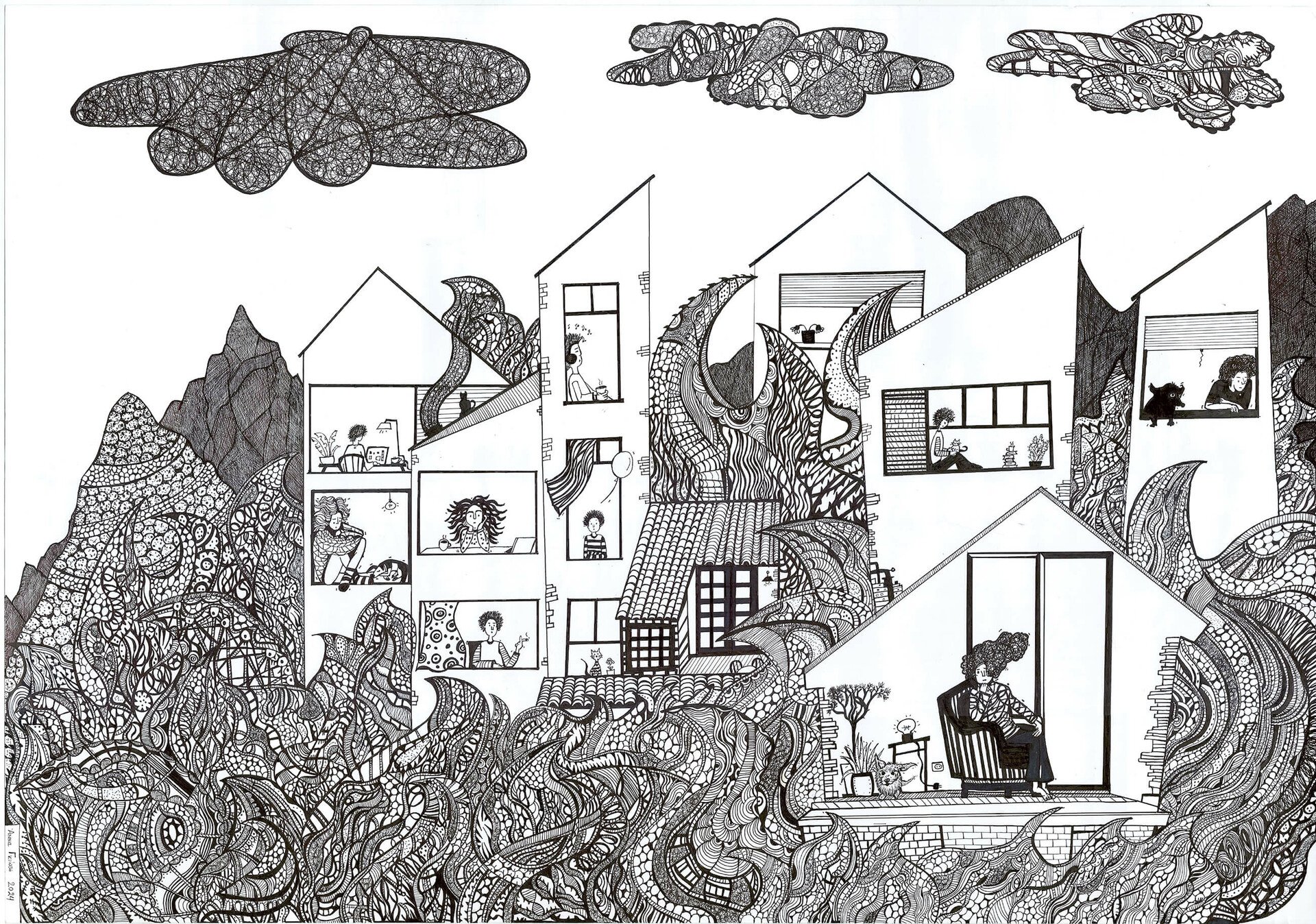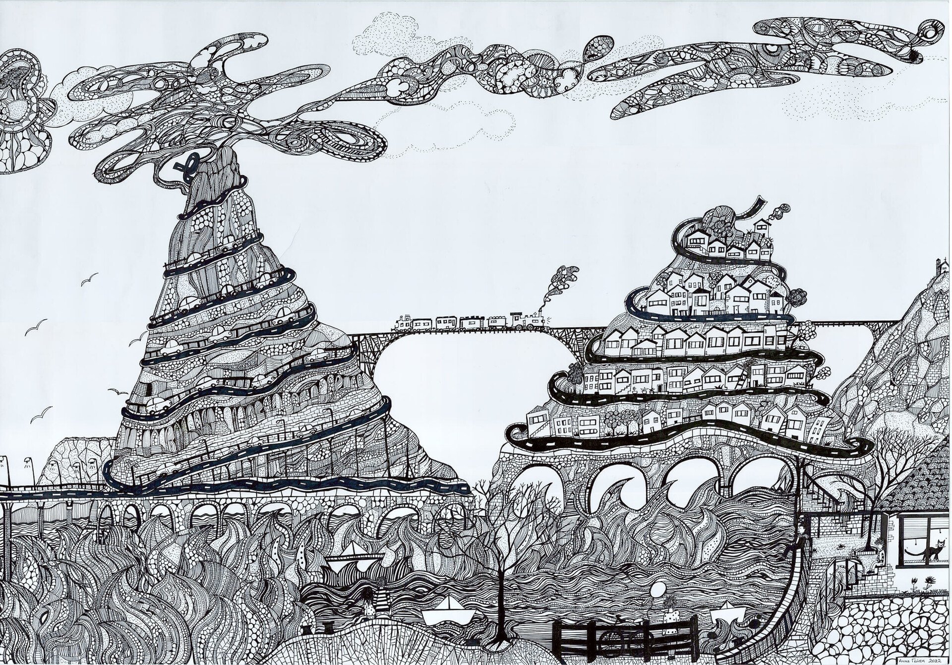 Σημειώνει μεταξύ άλλων ο Επιμελητής κ. Πάρης Καπράλος στο κείμενο τεκμηρίωσης της έκθεσης: “.....ο σουρρεαλιστικός τίτλος της έκθεσης υπονοεί την ύπαρξη ενός επιπέδου, ή καλύτερα μιας ψυχικής συνθήκης, που δεν είναι προσβάσιμη μέσω των γνώριμων και αυτοματοποιημένων μηχανισμών της καθημερινότητας. Δεν ανεβαίνει, αλλά βυθίζεται. Δεν ανήκει στον χώρο της εξωτερικής πραγματικότητας, αλλά στον χώρο της εσωτερικής συνθήκης. Είναι η περιοχή εκείνη που η σύγχρονη ζωή, με τους ρυθμούς, τις δομές και τις επιταγές της, έχει αφήσει έξω από το οπτικό της πεδίο – και που τα έργα της Άννας Γκιώτη ανασύρουν με συνέπεια και εμμονή. Τα έργα της συνθέτουν ένα ιδιότυπο σύμπαν, όπου η γραμμή γίνεται το βασικό εργαλείο έκφρασης. Μέσα από την επίμονη χρήση του μελανιού και την τεχνική του line drawing, η εικαστικός χτίζει κόσμους περίκλειστους, ψυχικούς, με έντονη εσωτερικότητα και ρυθμική, σχεδόν υπνωτική δομή. Η επανάληψη, η λεπτομέρεια και η διαρκής ροή μοτίβων και συμβόλων αναδεικνύουν μια ιδιαίτερη μορφή ψυχογεωγραφίας, όπου το αστικό τοπίο μετατρέπεται ή επαναδιατυπώνεται σε ψυχική διάσταση. [...] Η εικαστική γλώσσα της Άννας Γκιώτη παραπέμπει στην ελευθερία του αυτοματισμού, ενίοτε φλερτάροντας με τη λογική της doodle art ή του zentangle, χωρίς όμως να εξαντλείται εκεί. Η ίδια η επανάληψη των μοτίβων υποδεικνύει μια έντονη ψυχική ενασχόληση με τη λεπτομέρεια και τη φόρμα, σαν να αποτελούν κάθε φορά μια νέα απόπειρα χαρτογράφησης του εσωτερικού κόσμου.