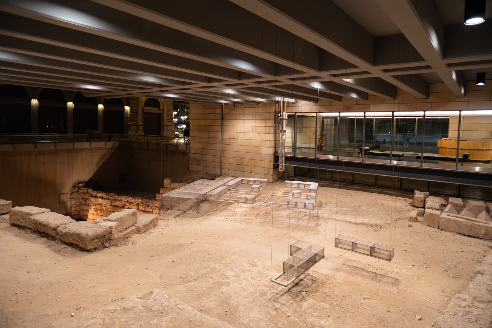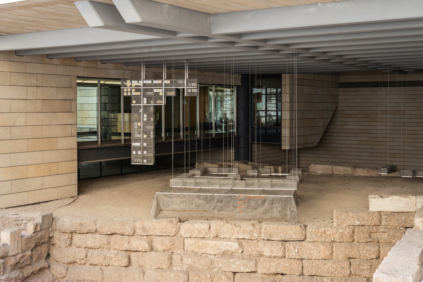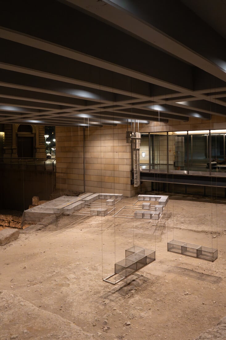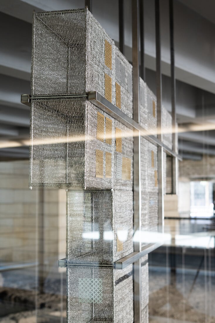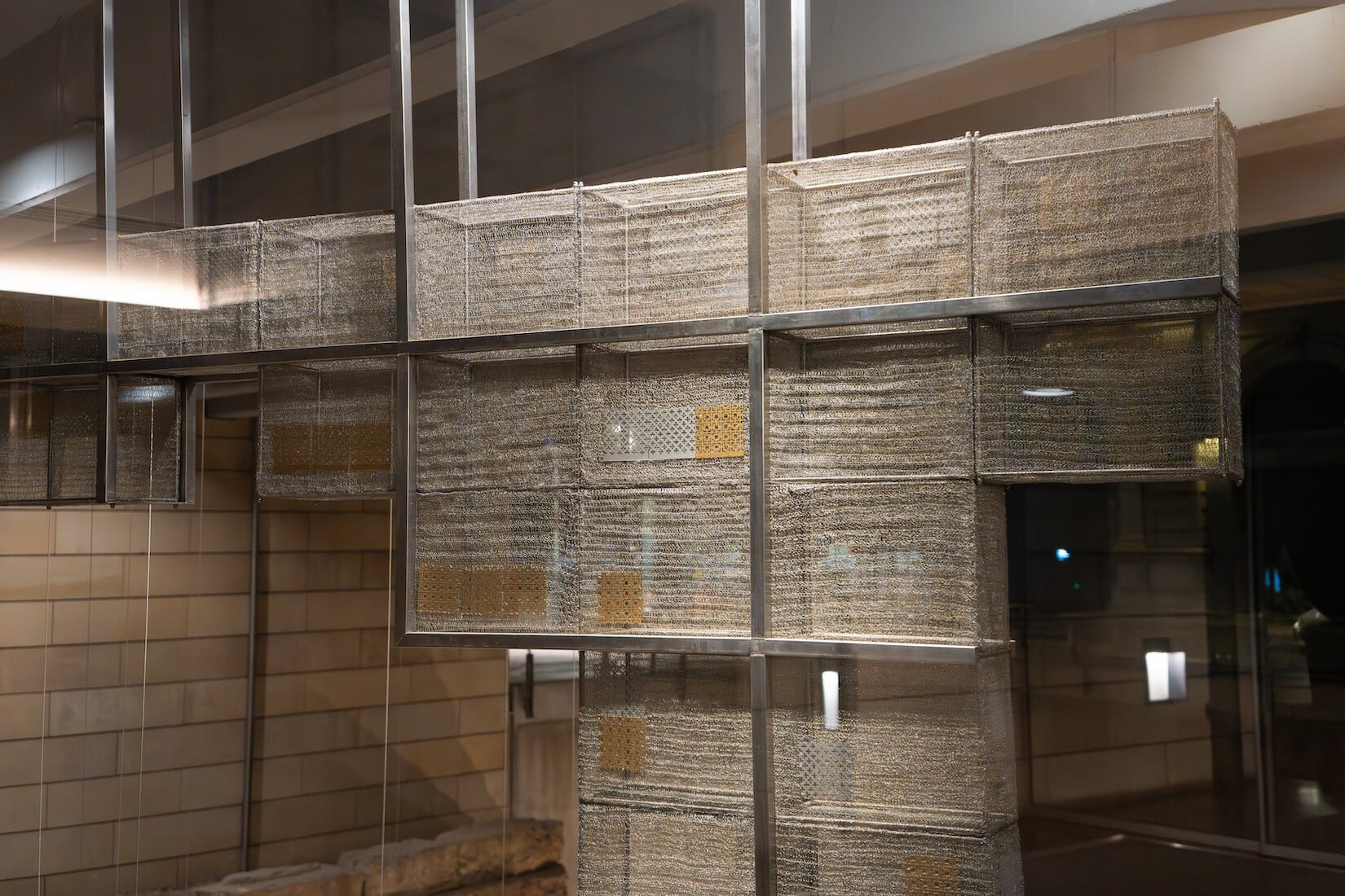 Η εγκατάσταση είναι αιωρούμενη και στηρίζεται από την οροφή του νέου κτιρίου. Το τεντωμένο χειροποίητο υλικό, φτιαγμένο με βελονάκι από ανοξείδωτο χάλυβα –χρειάστηκε 10.800 ώρες χειρωνακτικής εργασίας για να φτιαχτεί– έρχεται να προστατεύσει τα αρχαιολογικά ευρήματα στον ενδιάμεσο κενό χώρο μεταξύ του νέου και του αρχαίου. Οι χιλιάδες επαναληπτικές χειρονομίες μιας απλής πρακτικής, αυτής του πλεξίματος, μετρούν τον χρόνο, αποδίδοντας σεβασμό στη συντήρηση της συσσωρευμένης ενέργειας της ανθρωπότητας.