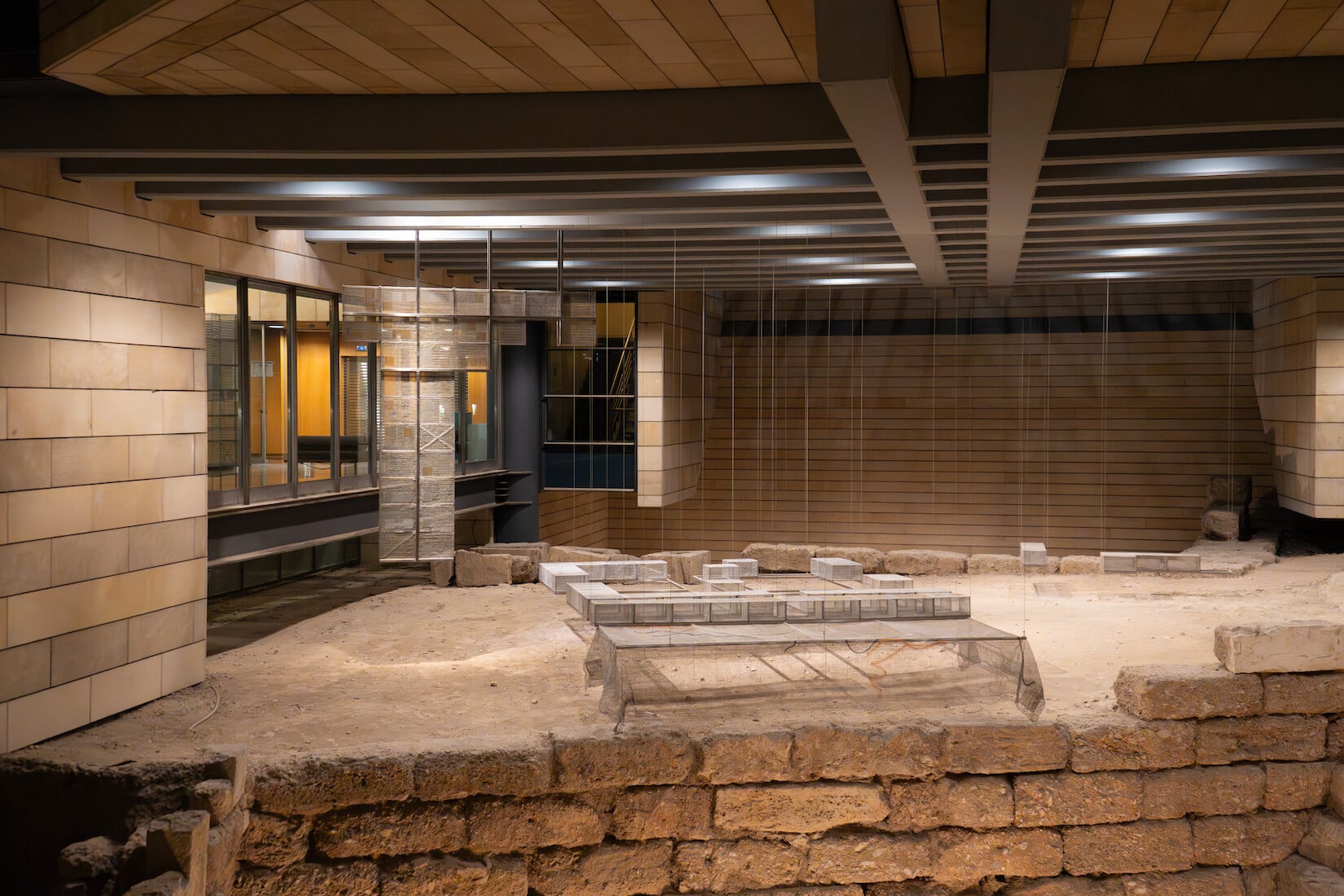 «Το σχήμα των επαναληπτικών τεμαχίων, κύριο κομμάτι του έργου στην αναδιαμόρφωση των αναρτημένων δαπέδων και κολονών, αναφορά του αρχαίου ογκόλιθου, χρησιμοποιείται σε αριθμητική υποδιαίρεσή του ως συνδετικό στοιχείο που συνυπάρχει στο αρχαιολογικό εύρημα και στο σύγχρονο κτίριο στην προσπάθεια σύνδεσης της ιστορίας. Το διάφανο πλέγμα που τα καλύπτει ελευθερώνει χώρο στη συνέχεια των ζωών μας, ντύνοντας τον κάθε όγκο ξεχωριστά χωρίς να κρύβει τον εσωτερικό του χώρο, προσδίδοντάς του έναν ρόλο αποθήκευσης της ιστορίας του καθημερινού ανθρώπου της οδού Αιόλου, κάθε γεωγραφικής προέλευσης και κοινωνικής ταυτότητας, από την αρχαιότητα μέχρι σήμερα. Αποδίδει τη σημασία της φανέρωσης και του πιο μικροσκοπικού κόκκου χώματος που απλώνεται στο δάπεδο της αρχαίας οδού. Η αίσθηση της ανύψωσης και της αιώρησης της εγκατάστασης μαζί με τις χιλιάδες επαναληπτικές χειρονομίες μιας απλής πρακτικής, αυτής του πλεξίματος, μετρά τον ενδιάμεσο χρόνο με τις εκατοντάδες χιλιάδες πατημασιές και μας προσκαλεί να τις αφουγκραστούμε», σημειώνει η Μαρία Λοϊζίδου.