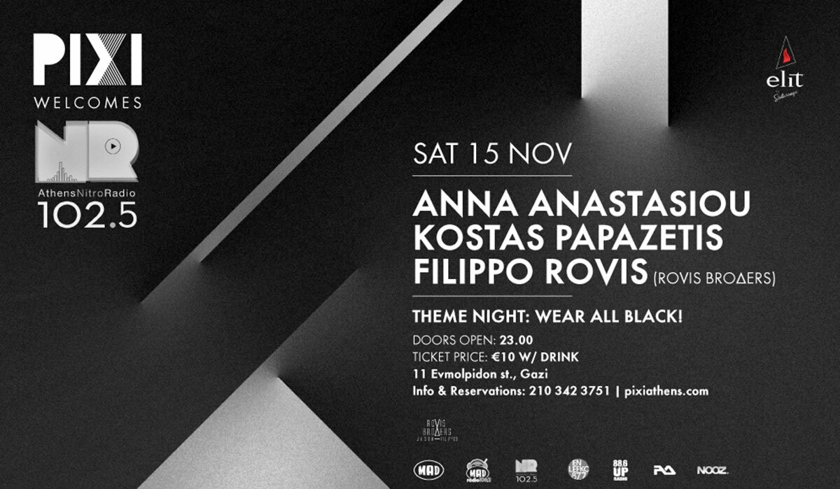 Το Σάββατο 15 Νοεμβρίου το PIXI υποδέχεται το Nitro radio 102,5 και τους παραγωγούς του, Άννα Αναστασίου και Κώστα Παπαζέτη.