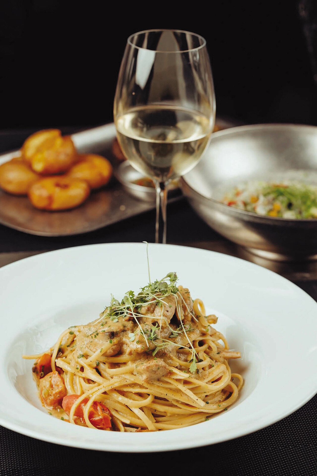 Στο μενού φυσικά και θα βρεις το κλασικό Vitello Tonnato –έτσι όπως θα σ’ το μαγείρευαν σε μια osteria του Μιλάνου–, εννοείται ότι θα απολαύσεις pasta (στην κατηγορία αυτή θα υπάρχουν και προτάσεις με φρέσκα ζυμαρικά) φτιαγμένη με όλη την αριστοτεχνία που της αρμόζει για να λέγεται ιταλική, και δεν γίνεται να λείπει η pizza του Νότου, εκείνη με την πολύ λεπτή, επίπεδη ζύμη που αποδεικνύει πως αυτό είναι ένα από τα λίγα comfort food με τόσες πολλές σχολές, εκδοχές και τόπους καταγωγής. Εδώ μιλάμε για ένα ζυμάρι που διαφέρει από το ναπολιτάνικο, γιατί αν και προέρχεται από την ίδια περιοχή, αντλεί την παράδοσή του από τη Σικελία ή την Καλαβρία και είναι πιο τραγανό και λεπτό, χωρίς φουσκωμένο στεφάνι.