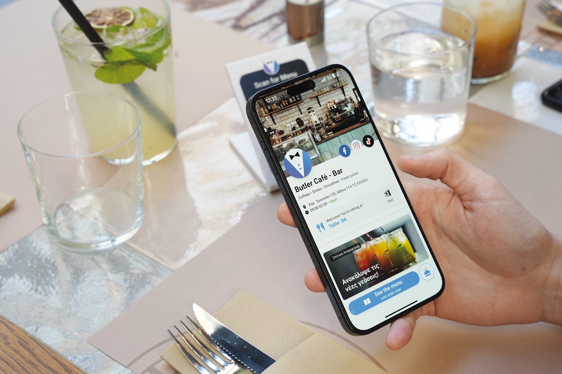 Κι όταν φτάσεις στον χώρο που διάλεξες, το Butler γίνεται αυτό που υπόσχεται το όνομά του: ένας ψηφιακός βοηθός. Σκανάρεις το QR που βρίσκεις στο τραπέζι, βλέπεις το μενού, παραγγέλνεις χωρίς να διακόψεις την κουβέντα –η παραγγελία σου οδηγείται κατευθείαν στο μπαρ ή στην κουζίνα–, καλείς τον σερβιτόρο χωρίς καν να σηκώσεις το βλέμμα, πληρώνεις όταν θες και φεύγεις χωρίς αναμονή.
