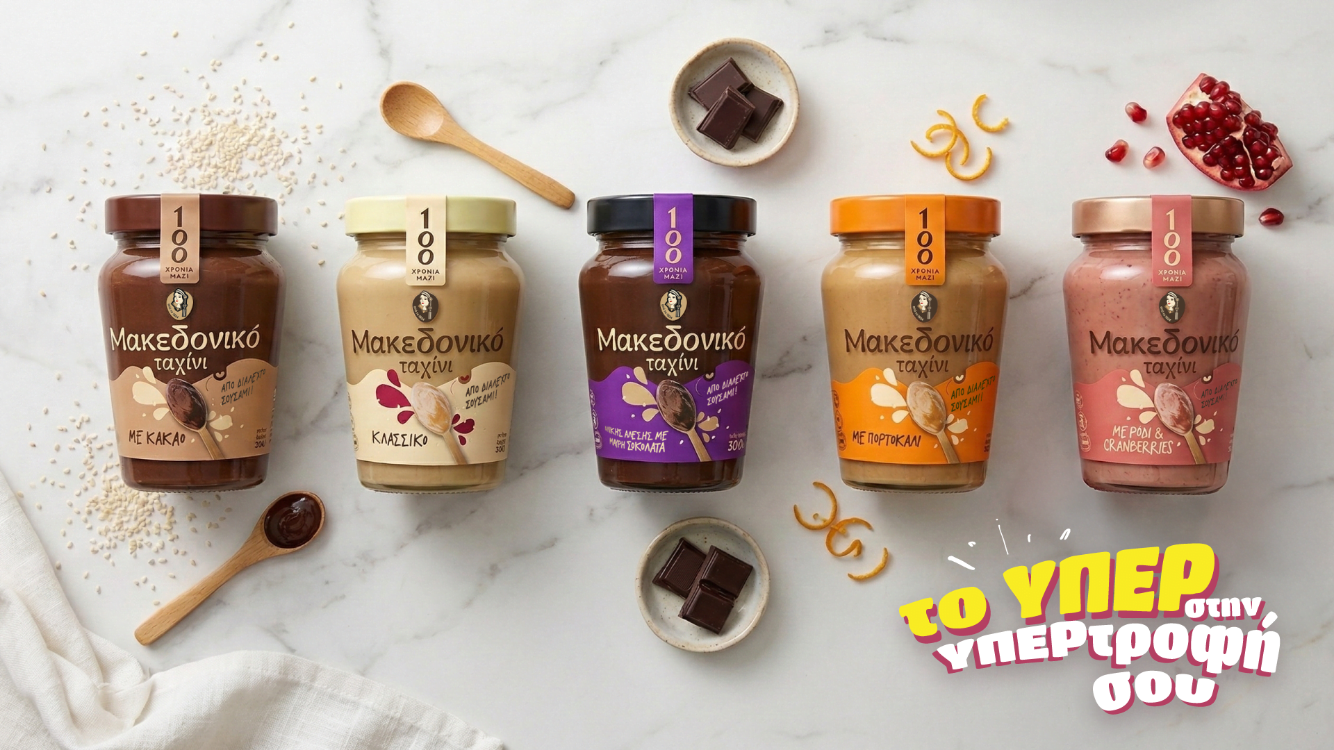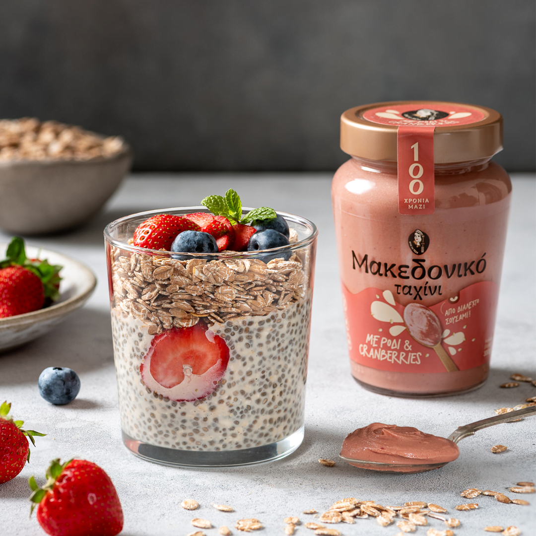 Έτσι, αν περνάς την περίοδο με γλυκά πρωινά θα γίνεις κολλητός με το Μακεδονικό Ταχίνι με Πορτοκάλι, με Ρόδι & Cranberries ή Espresso, ενώ αν θες ένα δυναμωτικό smoothie ή μια υγιεινή μπάρα πριν την προπόνηση θα προτιμήσεις το Μακεδονικό Ταχίνι Ολικής Άλεσης με Μαύρη Σοκολάτα ή το ολοκαίνουριο Μακεδονικό Ταχίνι με Πρωτεΐνη και Φυτικές Ίνες για έξτρα boost.