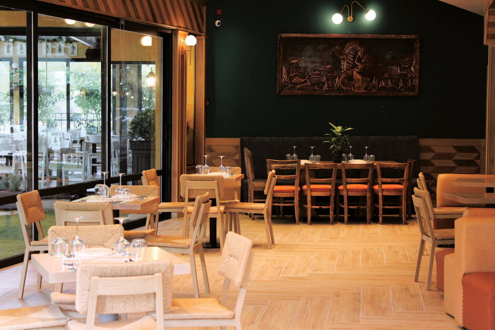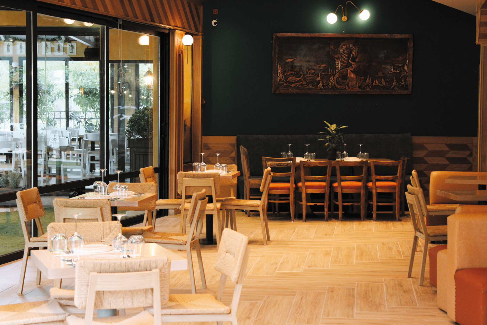 Ο εσωτερικός χώρος με τη σύγχρονη αρχιτεκτονική έχει τη ζεστασιά ενός καλοφτιαγμένου café-restaurant. Άπλετο φως το πρωί, χαμηλός φωτισμός το βράδυ, ξύλο, καθαρές γραμμές και προσοχή σε κάθε λεπτομέρεια. Δεν είναι τυχαίο ότι το Ρυθμός Hall έχει εξελιχθεί σε ιδανικό μέρος για όλες τις στιγμές της ημέρας: για καφέ, για χαλαρή συνάντηση, για brunch, για δουλειά εκτός γραφείου αλλά και για εκείνες τις προσωπικές στιγμές που θες ένα ήρεμο καταφύγιο.