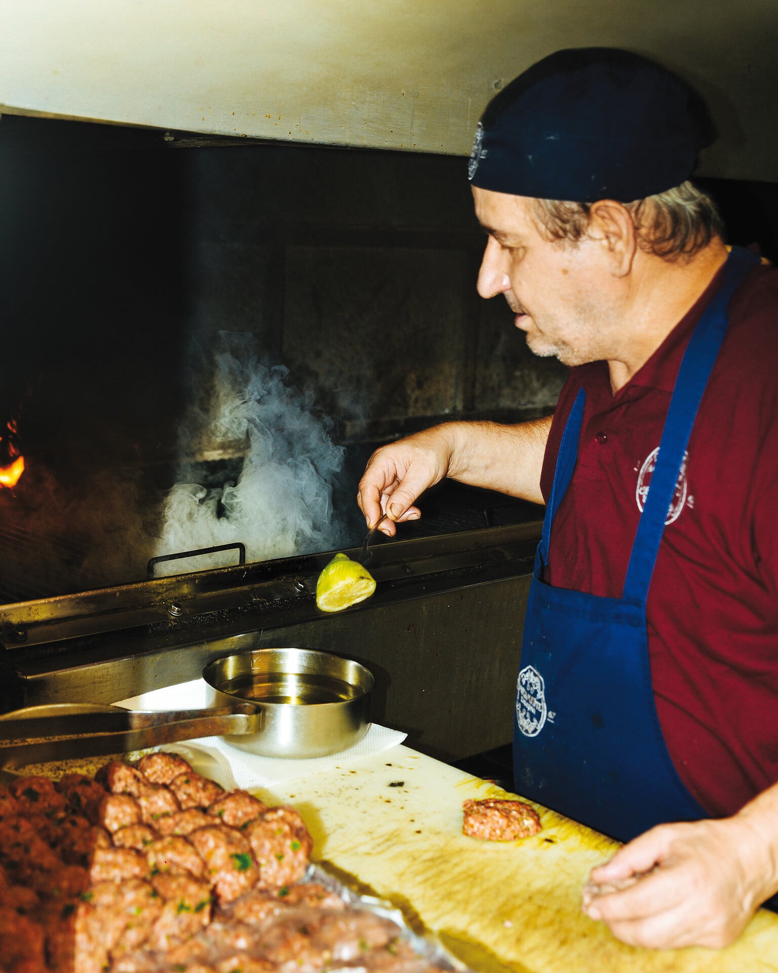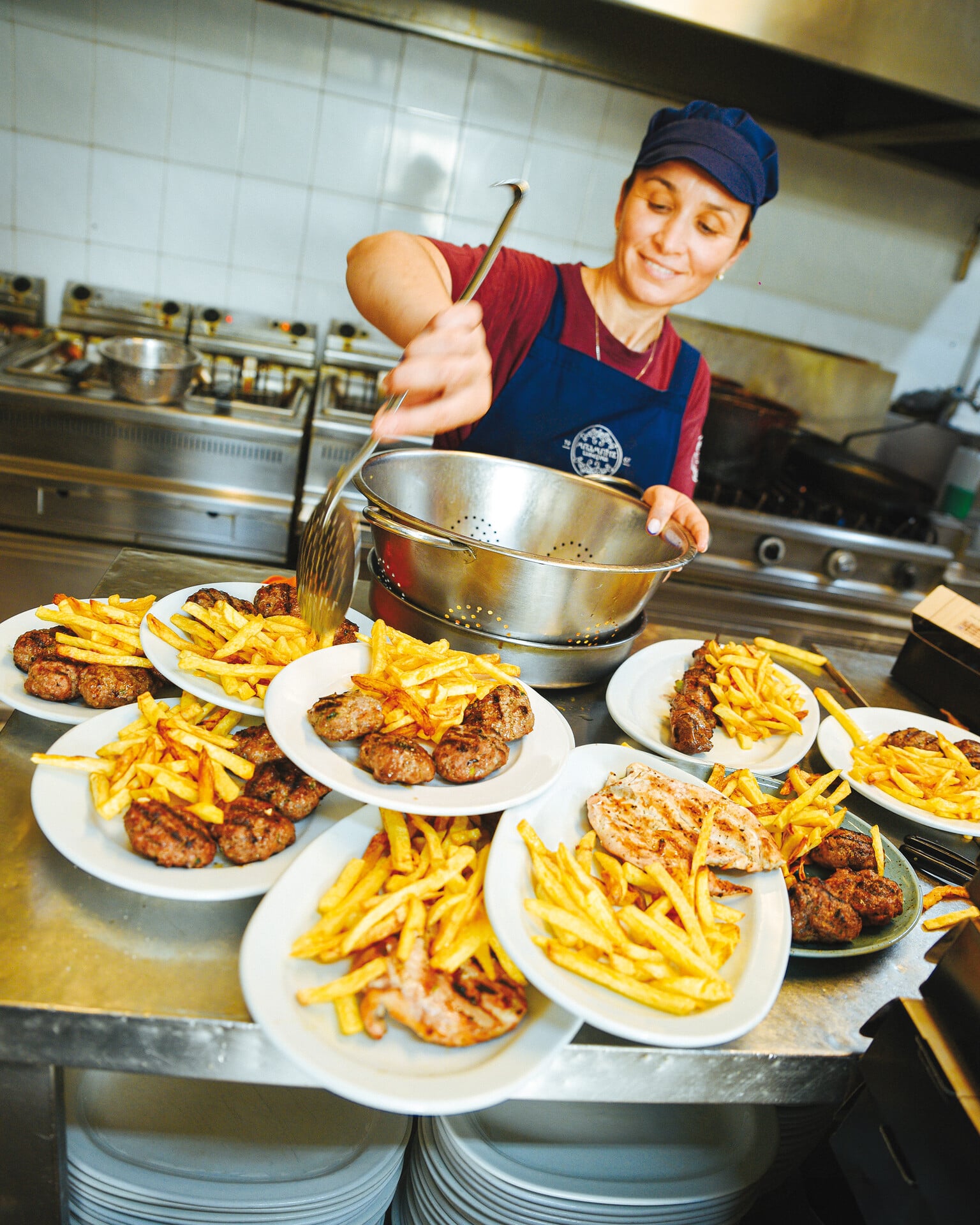 Πίσω από αυτή την αίσθηση βρίσκονται πάντα τα ίδια πρόσωπα. Ο κύριος Βασίλης, ο ψήστης, είναι σχεδόν θρύλος. Τον ξέρεις προτού τον γνωρίσεις: είναι αυτός που ρίχνει λίγο λεμόνι στη σχάρα «για να ξυπνήσει η φωτιά» και που ψήνει τα μπιφτέκια –ένα από τα πιο διάσημα πιάτα του μαγαζιού– με την ακρίβεια ανθρώπου που γνωρίζει καλά την τέχνη που θέλουν τα κάρβουνα. Για να ξέρεις ποιον πρέπει να ευχαριστήσεις όταν απολαμβάνεις μια απίστευτη μπριζόλα ή ένα κλασικό λουκάνικο, αλλιώτικο απ’ ό,τι είχες δοκιμάσει ως τώρα!