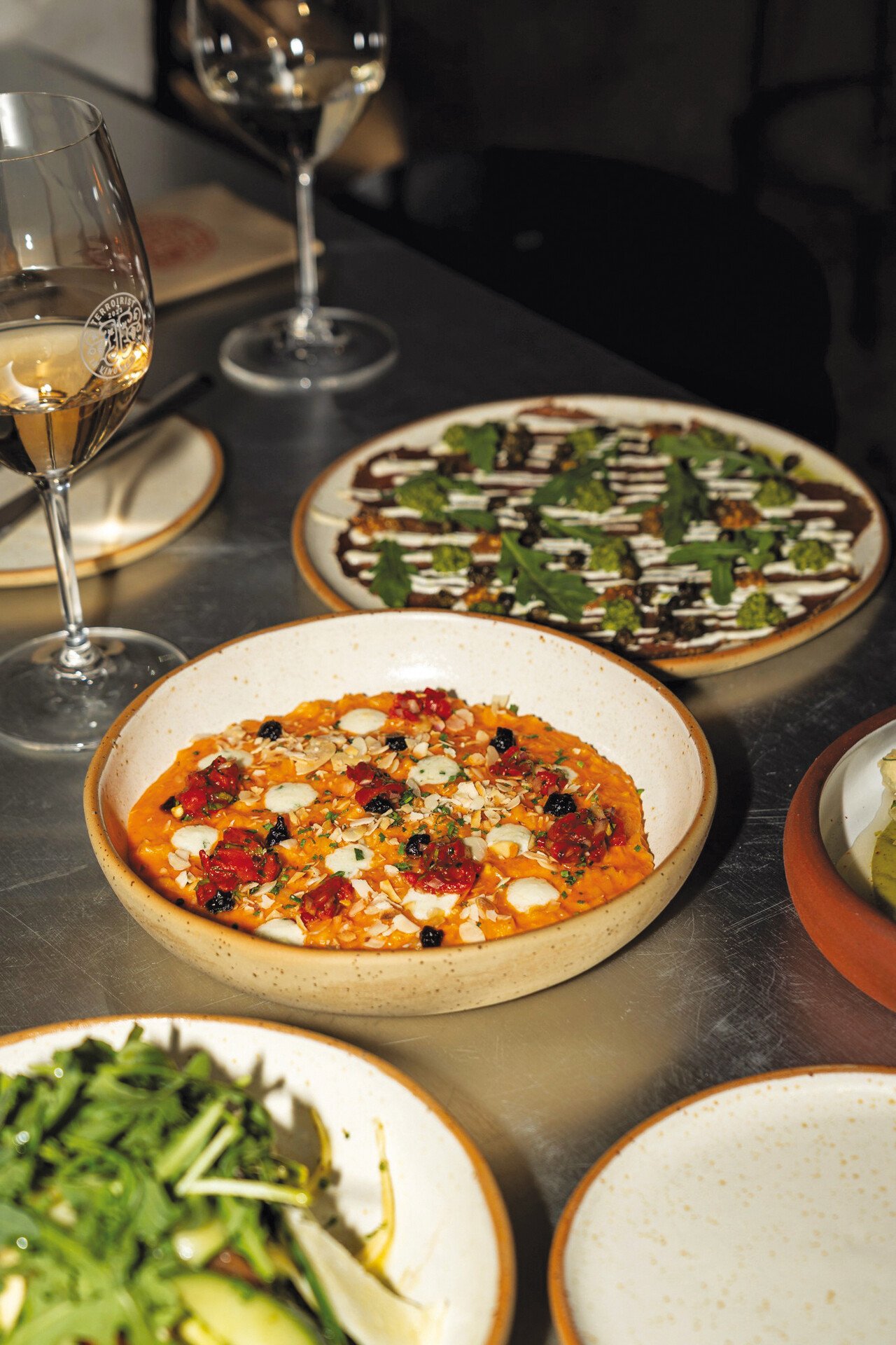 Στην κουζίνα, τα πιάτα έχουν χαρακτήρα, δημιουργικότητα και ισορροπία, με έμφαση στα αλλαντικά και τα τυριά μικρών παραγωγών αλλά και σε vegetarian ή vegan επιλογές που φέρνουν στο τραπέζι εποχικότητα και γευστική φρεσκάδα. Παράλληλα, το concept News of the Week προσφέρει κάθε φορά μια νέα πρόταση: ο Βαγγέλης Ντομόπουλος επιλέγει κρασιά εκτός λίστας, τα οποία ο σεφ Βασίλης Τσαυλής συμπληρώνει με πιάτα φτιαγμένα ειδικά για να τα αναδείξουν – μια δημιουργική συνεργασία που εξελίσσεται διαρκώς και εμπλουτίζει το μενού.
