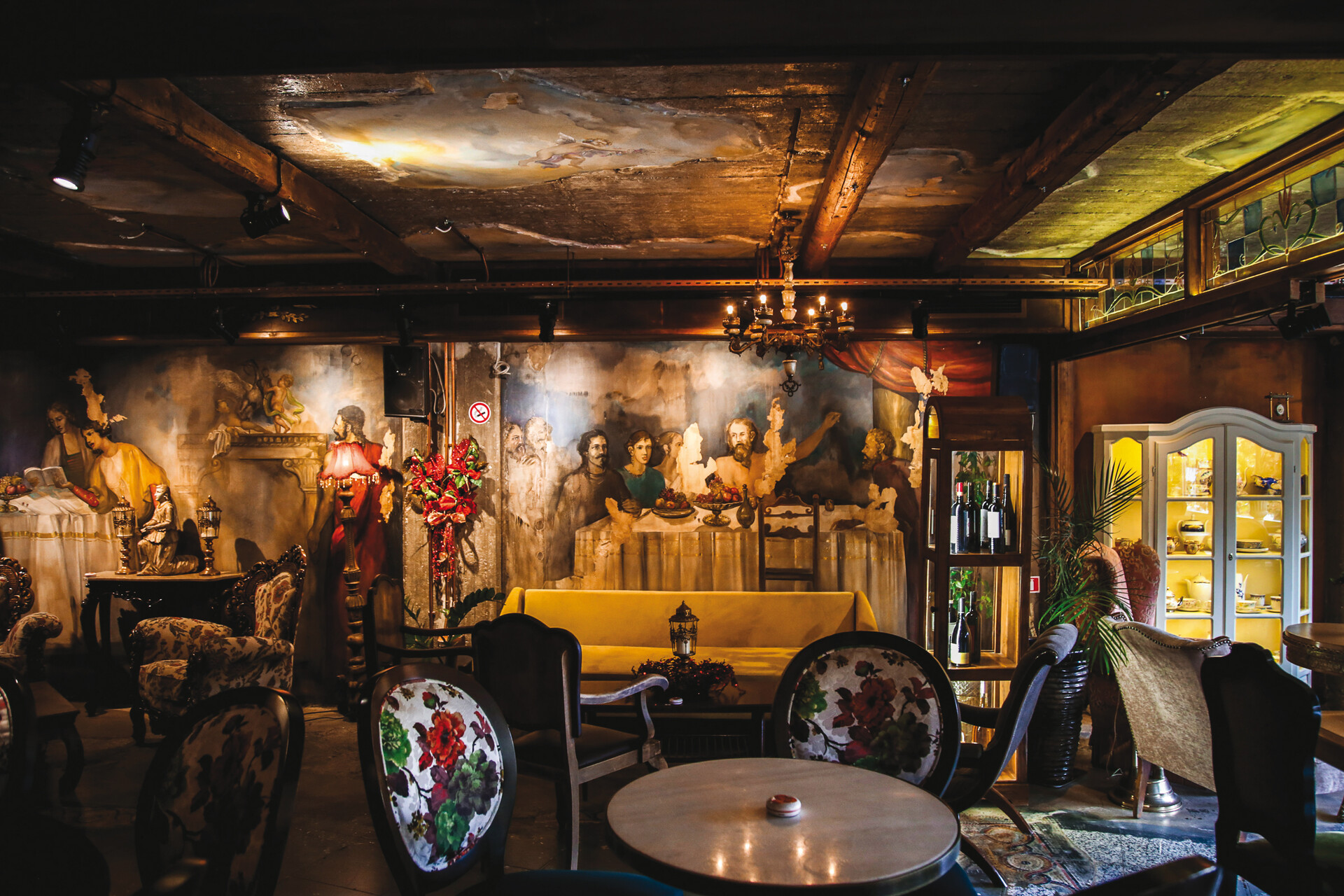 Εδώ παντρεύονται με τον πιο περίεργο τρόπο δύο ξεχωριστά μαγαζιά με δύο εισόδους, η μία επί της Αμαλίας και η άλλη στο βάθος της μικρής στοάς Όθωνος. Ο κάτω όροφος, με είσοδο από την Αμαλίας, μοιάζει με αμερικανικό diner με μια δεκάμετρη μπάρα και σεπαρέ δερμάτινα καθίσματα τρένου που σε ταξιδεύουν σε μια άλλη εποχή. Στο βάθος, η πλατιά, στολισμένη σκάλα σε οδηγεί στον δεύτερο όροφο, σε ένα γαλλικό μπιστρό με αναγεννησιακές τοιχογραφίες και έπιπλα vintage, όλα αναπαλαιωμένα.