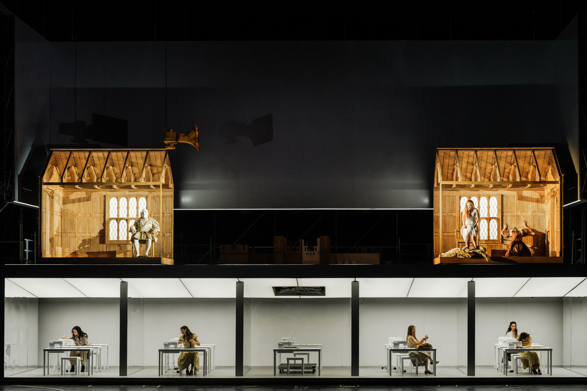 Το σκηνικό οργανώνεται ως αρχειακό οικοσύστημα, όπου η Α΄ Πράξη ισορροπεί ανάμεσα στην επίκληση της ιστορικής πιστότητας και την αποκάλυψη της ιστορίας ως αντιγράφου, ενώ στη Β΄ Πράξη ο χώρος μετατρέπεται σε μουσείο, όπου αντικείμενα και πρόσωπα εκτίθενται ως τεκμήρια μιας παγιωμένης αφήγησης. Παράλληλα, το ηχητικό περιβάλλον που δημιουργείται για την παράσταση λειτουργεί ως αρχειακή παρέμβαση που διακόπτει την αυτάρκεια του μπελ κάντο, φέρνοντας στο προσκήνιο τη βία που το έργο έχει αισθητικοποιήσει. Ιδιαίτερη έμφαση δίνεται στη σκηνή της τρέλας, όπου η φωνητική ακρότητα εκτίθεται ως θέαμα και η γυναικεία φωνή ως πεδίο φετιχοποίησης. «Η ιστορία δεν είναι ένα κλειστό αφήγημα προς αναπαράσταση, αλλά ένας ζωντανός μηχανισμός που μας διαμορφώνει», επισημαίνει ο σκηνοθέτης, προτείνοντας μια παράσταση που δεν αναπαριστά απλώς το παρελθόν, αλλά δοκιμάζει τα όρια της δικής μας σχέσης μαζί του.