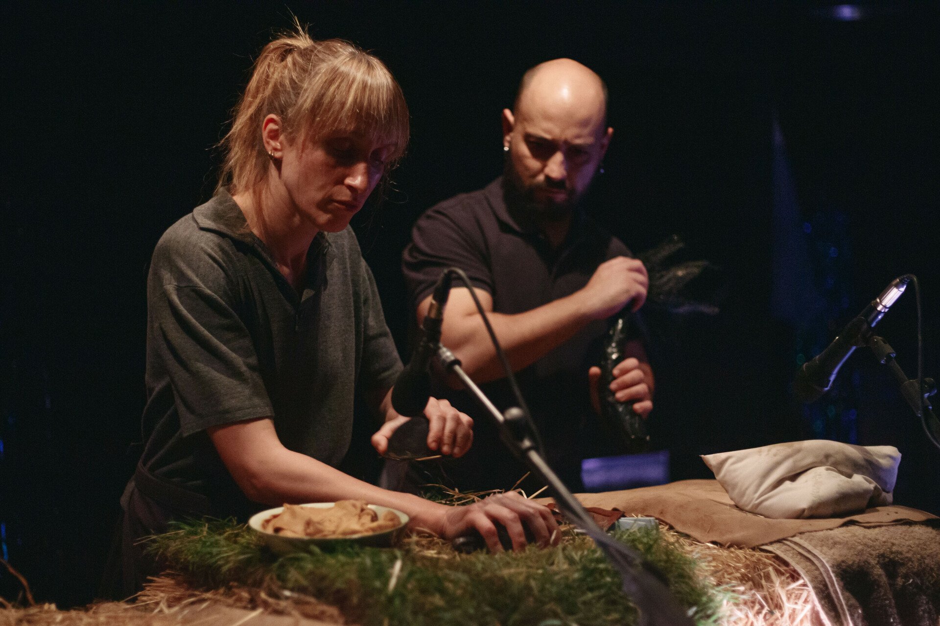 Εκκινώντας έναν νέο διάλογο ανάμεσα στο θέατρο, τη φύση, το σώμα και τον ήχο, στο Cow | Deer ζώα, έντομα και στοιχεία της φύσης δεν αποτελούν πια το σκηνικό της ζωής μας, αλλά ισότιμους συμμέτοχους ενός εύθραυστου οικοσυστήματος. Μέσα από ζωντανά ηχητικά εφέ (τεχνική Foley), σε συνδυασμό με αυθεντικές ηχογραφήσεις φυσικών περιβαλλόντων, οι ερμηνευτές δημιουργούν ένα καθηλωτικό ηχητικό τοπίο – τη βροχή που πλησιάζει, το τρίξιμο των κλαδιών, τον βηματισμό των ζώων– που μεταφέρει τους θεατές στην εξοχή. Μια εμπειρία που επιτρέπει στο κοινό να «ακούσει» τον κόσμο όπως τον αντιλαμβάνεται ένα ζώο, που το καλεί να μην σταθεί, αυτή τη φορά, απέναντί του ως παρατηρητής, αλλά να συνδεθεί με τον δικό του παλμό, να βιώσει μια πρωτόγνωρη εγγύτητα με τη φύση, αλλά και να αντιληφθεί την ταραχή, τον φόβο και τον πόνο που μπορεί να του προκαλέσει.