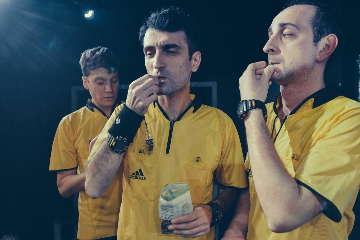 Τρείς νέοι άνδρες, κίτρινες και κόκκινες κάρτες, πέναλτι και οφσάιντ στο παιχνίδι των σχέσεων, με φόντο έναν αγώνα ποδοσφαίρου.