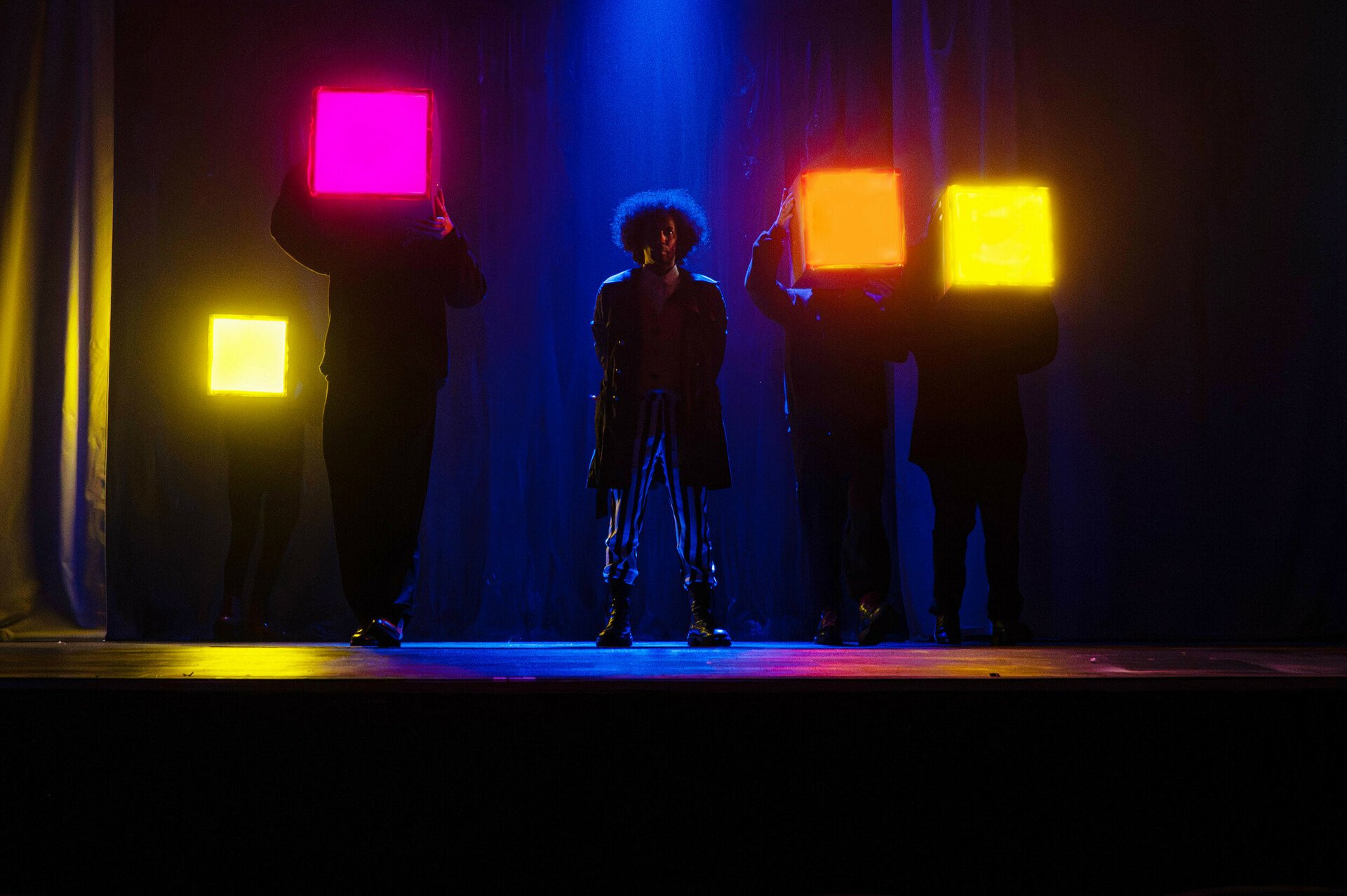 Η κινησιολογία του Αλέξανδρου Κεϊβάναη παίζει σημαντικό ρόλο στο αποτέλεσμα. Η παράσταση είναι «χτενισμένη» κινησιολογικά, σε κάθε χορογραφία αλλά και σε κάθε σκηνή. Εκτός από τα ανθρώπινα σώματα, το ίδιο το σκηνικό συμμετέχει στην κινησιολογία: χρωματιστοί, φωτεινοί κύβοι «χορεύουν» στη σκηνή, λειτουργώντας όχι μόνο ως εντυπωσιακό εικαστικό στοιχείο, αλλά και ως δραματουργικό μέσο — τα «κουτάκια» που στοιχίζονται ώστε να λυθεί το μυστήριο.
