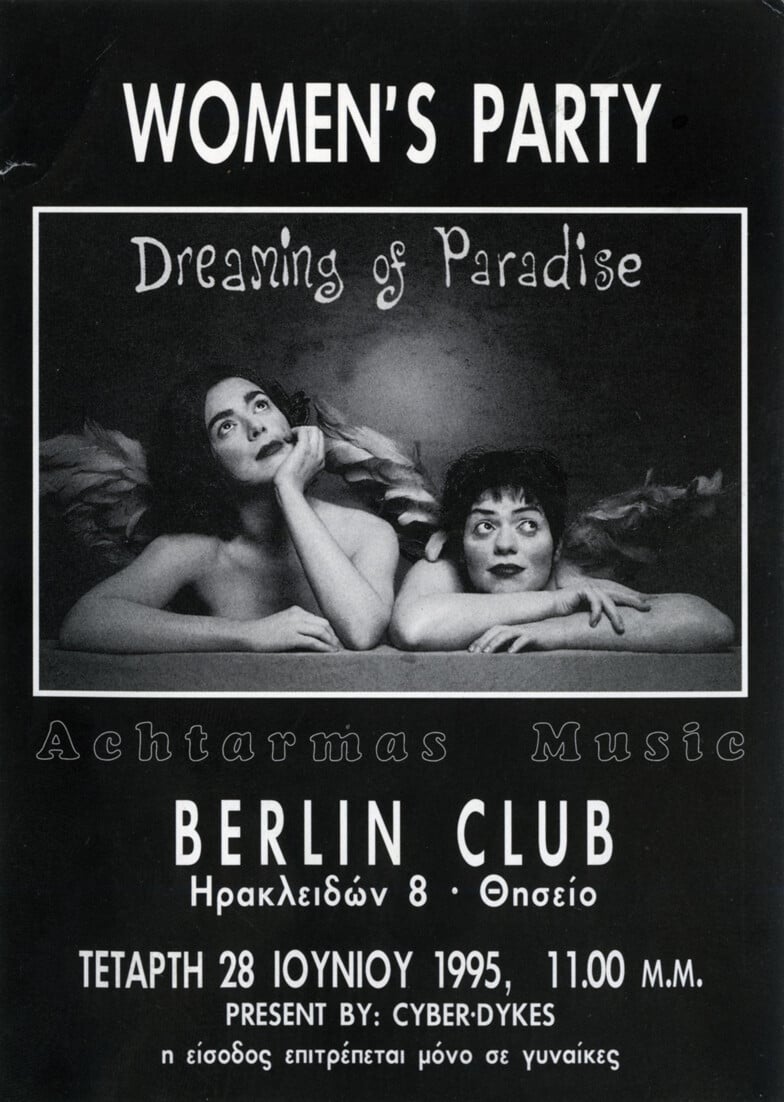 Τα Cyberdykes δεν ήταν μόνο πάρτι, ήταν τα μοναδικά σε όλη την Ελλάδα δρώμενα μόνο για γυναίκες και αυτό σήμαινε πολλά, όπως το γεγονός σε μια πόλη που έσφυζε από πάρτι να γίνονται λεσβιακά events με flyers, δελτία Τύπου, θεματικές, και να δίνουν τεράστια ορατότητα της κοινότητάς μου και στην πόλη μου. Berlin, Booze, Mad, Underworld, ήταν μερικά από τα κλαμπ που κατακτούσαμε! Σκεφτόμουν το εκάστοτε θέμα, έφτιαχνα το δελτίο Τύπου, το έβγαζα φωτοτυπίες, έφτιαχνα όμορφους φακέλους και ετοίμαζα τα γράμματα που άφηνα σε πολλά έντυπα και ραδιόφωνα – τότε δεν έστελνες μαζικά emails. Σχεδίαζα με τη βοήθεια φιλενάδων και φίλων τα flyers, τα εκτύπωνα και γύρναγα δεκάωρα καθημερινά σε ΟΛΗ την Αθήνα με τη μηχανή και μοίραζα δελτία Τύπου στα media και τα flyers στον κόσμο, μπόλικες φορές, ευτυχώς, με παρέα. Ήταν πολύ δύσκολο το μοίρασμα των flyers σε πλατείες και σε κόσμο μόνη μου, έκανα υπέρβαση του εαυτού μου για να βρω το κουράγιο. Η ψυχή μου το ήξερε πόσο ζόρικο ήταν να αντιμετωπίζεις τον κόσμο καταπρόσωπο. Στις πλατείες και στους δρόμους, οι ιστορίες αμέτρητες από το μοίρασμα ΛΕΣΒΙΑΚΟΤΑΤΩΝ flyers.