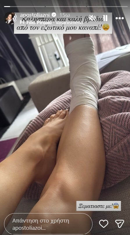 Η Αποστολία Ζώη βρέθηκε στο νοσοκομείο, σύμφωνα με πληροφορίες, μετά από ατύχημα, όταν έπεσε από τη σκάλα, με αποτέλεσμα να πάθει διάστρεμμα στο πόδι της.