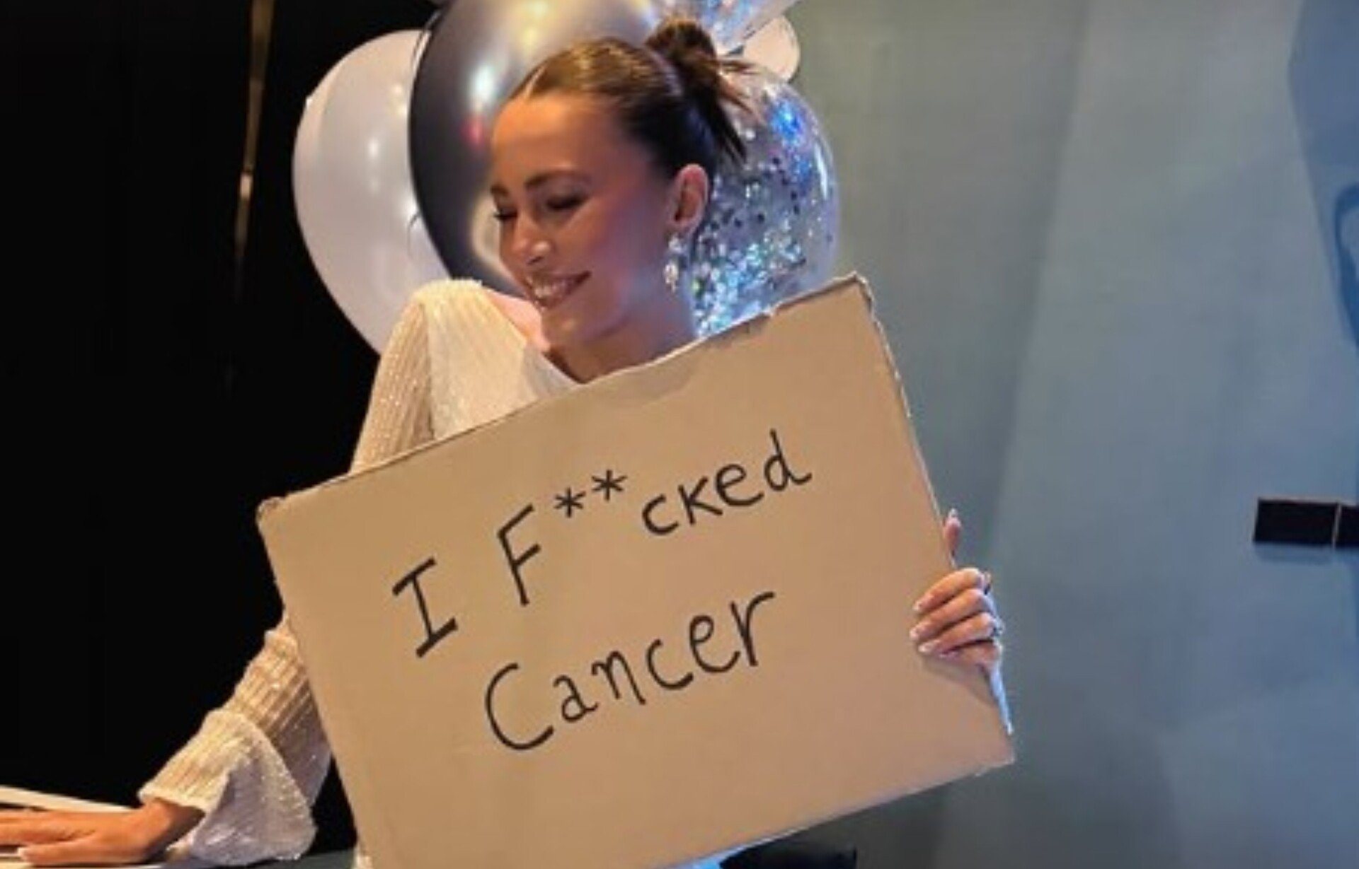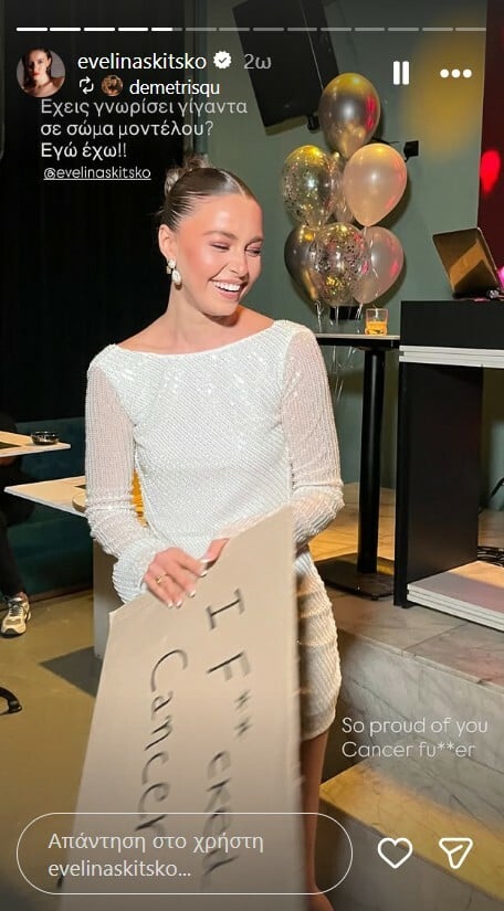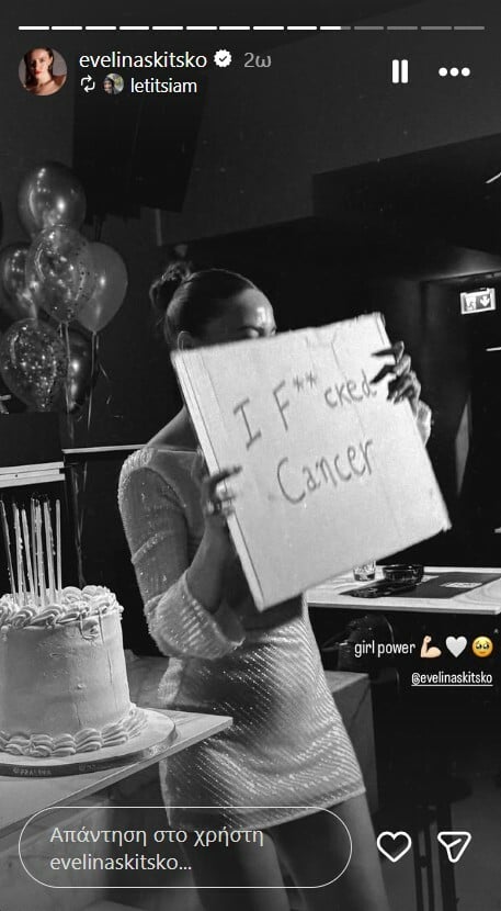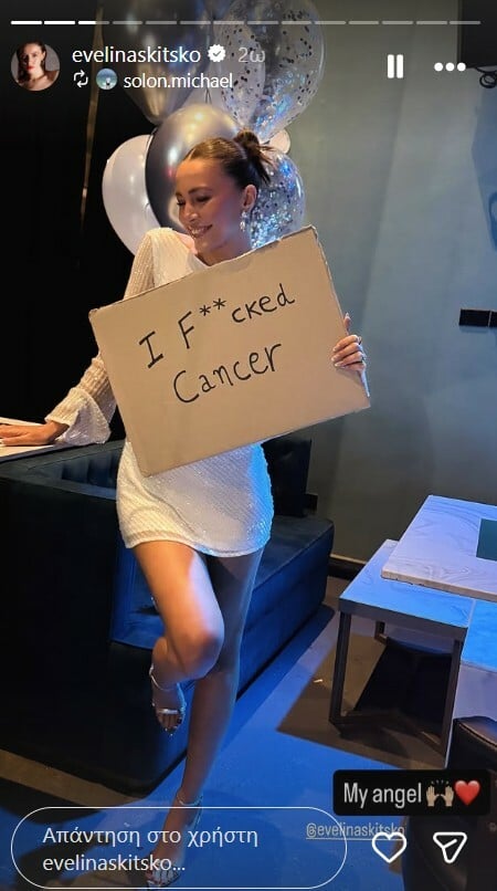 Μάλιστα, η πρώην παίκτρια του GNTM γιόρτασε την προσωπική της νίκη με ένα συγκινητικό πάρτι. Σε ένα από τα στιγμιότυπα που μοιράστηκε στα social media, το μοντέλο ποζάρει κρατώντας μια πινακίδα που έγραφε στα αγγλικά «Γ@μ@σ@ τον καρκίνο!».