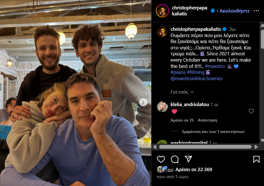 Οι τέσσερις πρωταγωνιστές του «Maestro», που αγαπήθηκε εντός και εκτός Ελλάδας μέσα από την επιτυχία της στο Netflix, πόζαραν μαζί για μία φωτογραφία και βίντεο, τα οποία ανήρτησε ο Χριστόφορος Παπακαλιάτης στο Instagram.