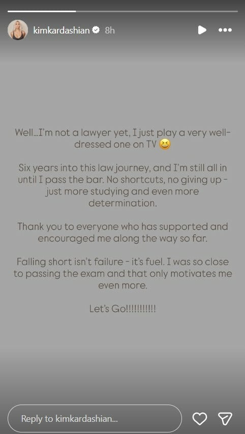 «Είμαι έξι χρόνια σε αυτό το ταξίδι και δεν τα παρατάω. Χωρίς παρακάμψεις, χωρίς να τα εγκαταλείψω, μόνο περισσότερη μελέτη και αποφασιστικότητα. Το να αποτυγχάνεις δεν είναι αποτυχία· είναι καύσιμο. Ήμουν τόσο κοντά αυτή τη φορά, και αυτό με πεισμώνει ακόμη περισσότερο. Πάμε!» έγραψε επίσης η Κιμ Καρντάσιαν.