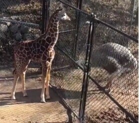 Στο βίντεο, η μικρή καμηλοπάρδαλη στέκεται κοντά σε έναν μεταλλικό φράχτη, με τα μακριά της πόδια ελαφρώς ανοιχτά και τον λαιμό τεντωμένο προς τα εμπρός, σαν να προσπαθεί να καταλάβει καλύτερα τι ακριβώς είναι το μεγάλο, φτερωτό πλάσμα απέναντί της. Από την άλλη πλευρά, η στρουθοκάμηλος περπατά αργά μέσα στον χώρο της, γυρίζοντας ανά διαστήματα το κεφάλι της προς το μέρος της καμηλοπάρδαλης.