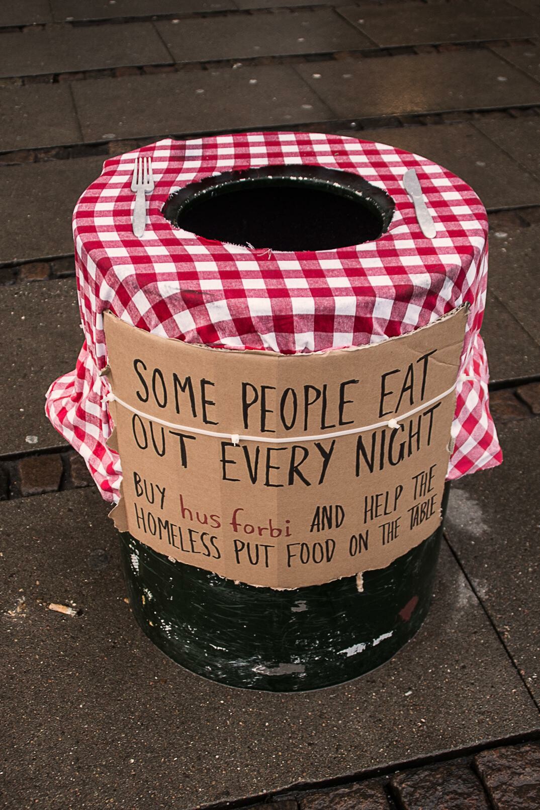 Για να τραβήξουμε την προσοχή, βάλαμε σε 11 κάδους σκουπιδιών τραπεζομάντηλο και μαχαιροπήρουνα και τους τοποθετήσαμε σε διάφορα σημεία της Κοπεγχάγης. Το χαρτόνι γράφει «μερικοί άνθρωποι τρώνε έξω κάθε μέρα. Αγοράστε την εφημερίδα hus forbi και βοηθήστε τους άστεγους να φάνε.»