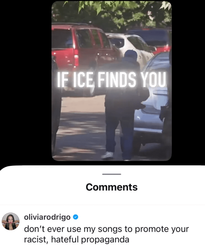 «Μην ξαναχρησιμοποιήσετε τα τραγούδια μου για να προωθήσετε τη ρατσιστική, γεμάτη μίσος προπαγάνδα σας», σχολίασε η Ροντρίγκο κάτω από την ανάρτηση του υπουργείου στο Instagram.