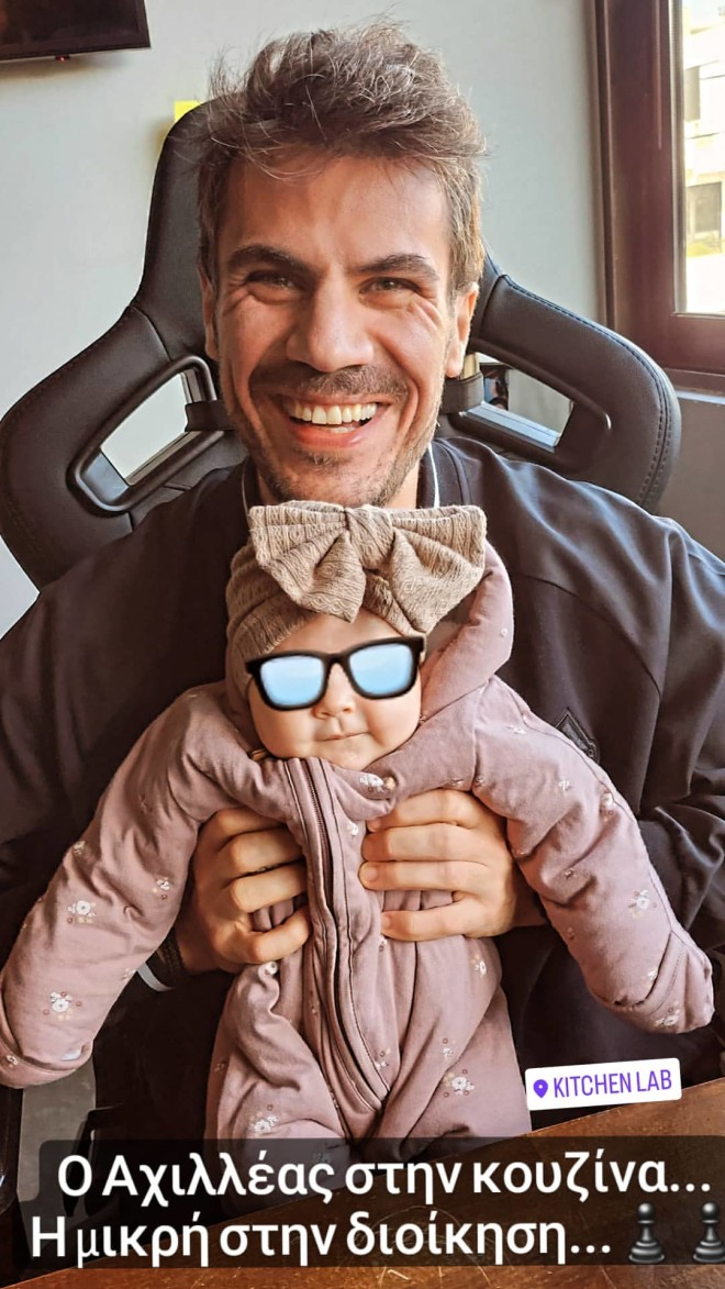 Ο γνωστός σεφ ανέβασε μια φωτογραφία σε Instagram Stories, όπου κρατά την κόρη του, η οποία είναι φοράει ένα ροζ φορμάκι-μπουφάν και έναν φιόγκο στο κεφάλι.