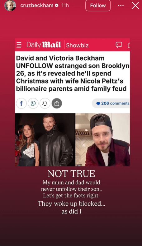 Την Κυριακή 21 Δεκεμβρίου, ο 20χρονος Κρουζ ανήρτησε στα Instagram Stories του ένα στιγμιότυπο οθόνης από άρθρο της Daily Mail που ανέφερε ότι οι γονείς του δεν ακολουθούν πλέον τον 26χρονο Brooklyn, εν μέσω μιας φερόμενης οικογενειακής διαμάχης.