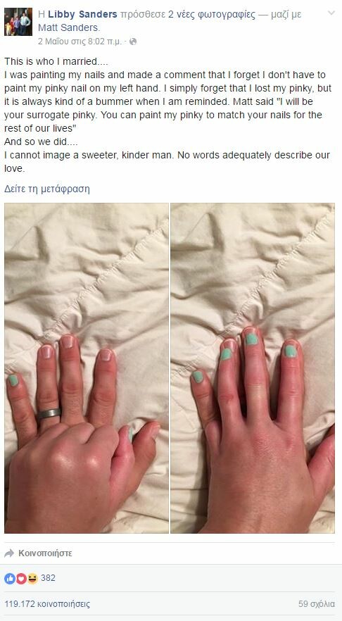 Πριν από λίγες μέρες καθώς έβαφε τα νύχια της, η Libby συνειδητοποίησε και πάλι πως πλέον το μικρό της δαχτυλάκι δεν είναι εκεί και μοιράστηκε τη σκέψη με τον άντρα της. Ο Μatt αμέσως προσέφερε το δικό του λέγοντας της πως μπορεί για το υπόλοιπο της ζωής του να το βάφει για να ταιριάζει με τα χρώματα στο δικό της χέρι.