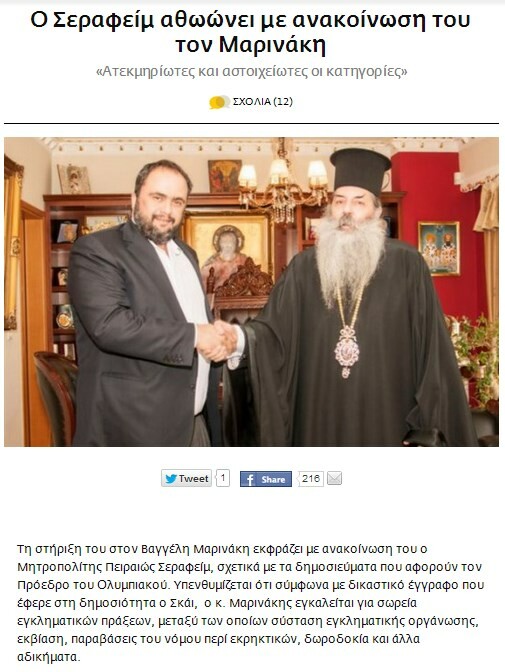 "Ἀπό τήν ἐνασχόληση μέ ἀνακριτικά καθήκοντα ἀρκετά χρόνια στήν Ἐκκλησιαστική Δικαιοσύνη, ἔχω τήν δυνατότητα νά ἐκφράσω δημόσια τήν γνώμη μου ἀναφορικά μέ τήν παρανόμως δημοσιοποιηθείσα πρόταση τοῦ Ἀντιεισαγγελέως Πλημμελειοδικῶν 'Αθηνῶν καθ' ὅ μέρος ἀφορᾶ αὐτή στόν Πρόεδρο τῆς ΠΑΕ ΟΛΥΜΠΙΑΚΟΣ Πειραιῶς καί ἐκλεγέντα πρῶτο Δημοτικό Σύμβουλο Πειραιῶς κ. Βαγγέλη Μαρινάκη ἀναφέρων ὅτι εἶναι ἀτεκμηρίωτη καί χωρίς οὐσιώδη στοιχειοθέτηση καί κατά ταῦτα ἀποβαίνει ἕωλος, ἀβάσιμος καί ἀνεπέρειστος."