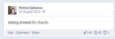 Και πριν καιρό είχε συζητηθεί το Facebook του Γαϊτάνου, εξαιτίας ενός status update που (αν θυμάμαι καλά) έλεγε πώς να διώξεις τα φαντάσματα απ' το σπίτι σου τραγουδώντας, ή κάτι τέτοιο.