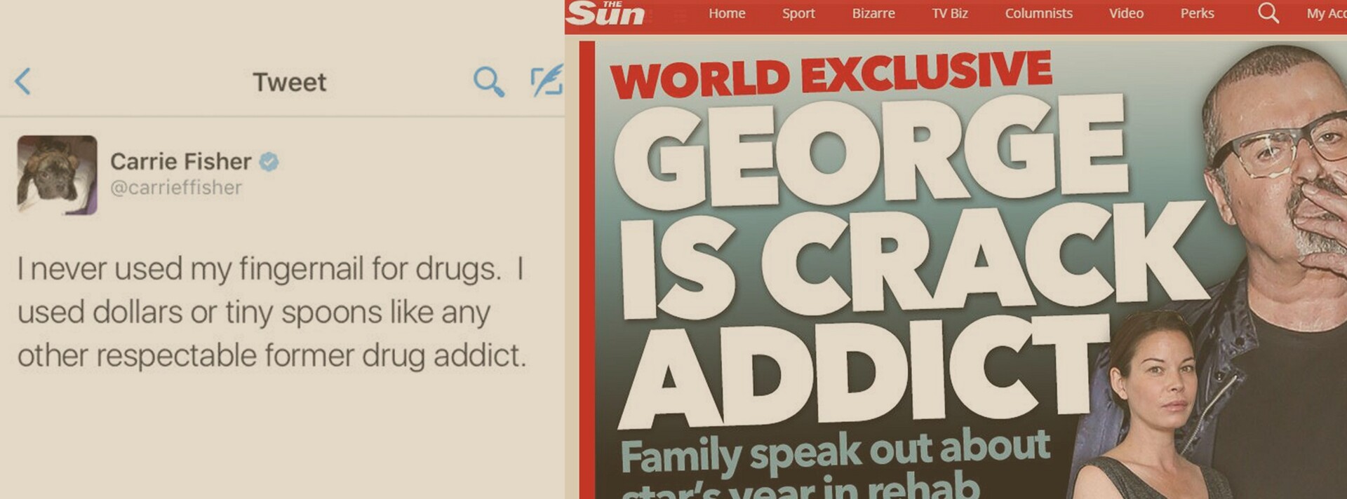 Ας δούμε τους δύο πιο πρόσφατους θανάτους διασήμων, του George Michael και της Carrie Fisher. Ο George Michael πέθανε από συγκοπή στα 53 κι η Carrie Fisher από καρδιακή προσβολή στα 60. Σύμφωνα με τους κοντινούς του ανθρώπους ο George Michael, που κάπνιζε μεγάλες ποσότητες κάνναβης καθημερινά για δεκαετίες, είχε προχωρήσει και σε πιο θανατηφόρα ναρκωτικά όπως είναι το crack cocaine. Η δε Carrie Fisher ήταν πασίγνωστη για τις καταχρήσεις κοκαΐνης και αλκοόλ και μιλούσε συχνά για αυτές.