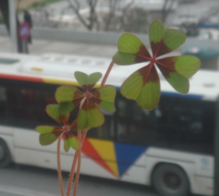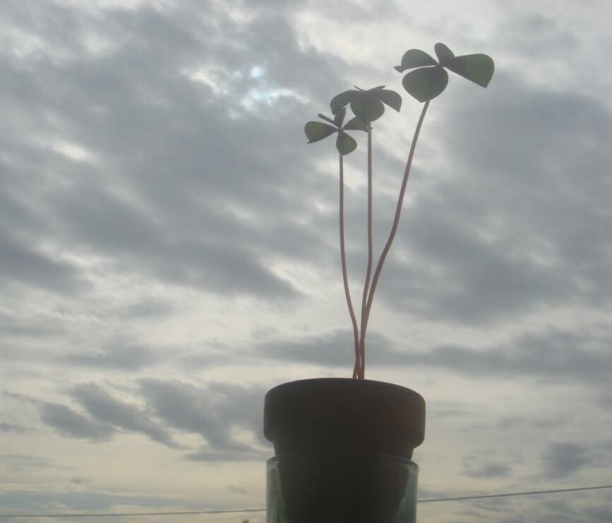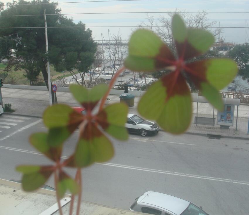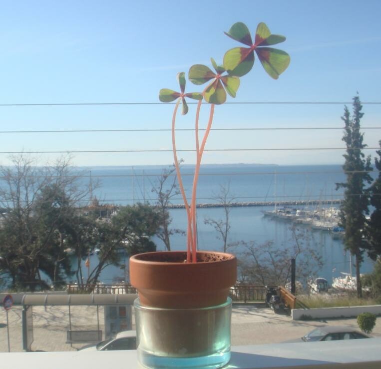 Όταν πρωτοβγήκαν τα τετράφυλλα τριφύλλια, θέλαμε να τα δείξουμε στη μαμά μου, αλλά επειδή δεν μετακινούνταν εύκολα πια και δεν ξέραμε πότε θα ερχόταν προς Καλαμαριά, βγάλαμε τη μικροσκοπική γλάστρα στο μπαλκόνι, και τη φωτογραφήσαμε, σα να ήταν μοντέλο και της δείξαμε τις φωτογραφίες.