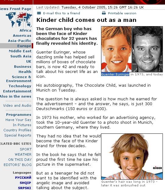 Στα πρόσφατα ελληνικά άρθρα (απ' το sarotiko μέχρι το gossip-tv.gr), η φράση "O Γερμανός Guenter Euringer, το παιδί της σοκολάτας για 32 χρόνια, είναι σήμερα 42 χρονών" ζει και βασιλεύει.
