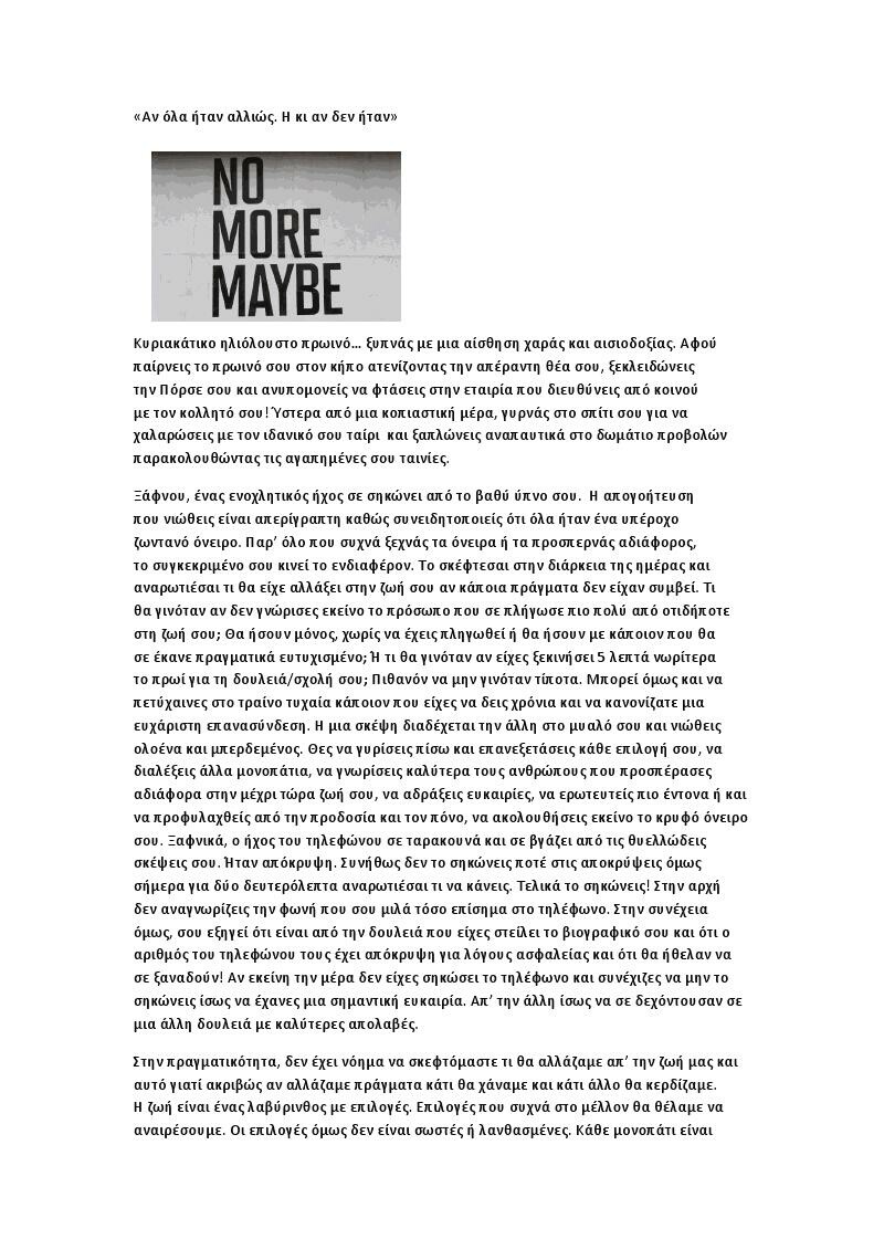 Ξαφνικά, ο ήχος του τηλεφώνου σε ταρακουνά και σε βγάζει από τις θυελλώδεις σκέψεις σου. Ήταν απόκρυψη. Συνήθως δεν το σηκώνεις ποτέ στις αποκρύψεις όμως σήμερα για δύο δευτερόλεπτα αναρωτιέσαι τι να κάνεις. Τελικά το σηκώνεις! Στην αρχή δεν αναγνωρίζεις την φωνή που σου μιλά τόσο επίσημα στο τηλέφωνο. Στην συνέχεια όμως, σου εξηγεί ότι είναι από την δουλειά που είχες στείλει το βιογραφικό σου και ότι ο αριθμός του τηλεφώνου τους έχει απόκρυψη για λόγους ασφαλείας και ότι θα ήθελαν να σε ξαναδούν! Αν εκείνη την μέρα δεν είχες σηκώσει το τηλέφωνο και συνέχιζες να μην το σηκώνεις ίσως να έχανες μια σημαντική ευκαιρία. Απ' την άλλη ίσως να σε δεχόντουσαν σε μια άλλη δουλειά με καλύτερες απολαβές.