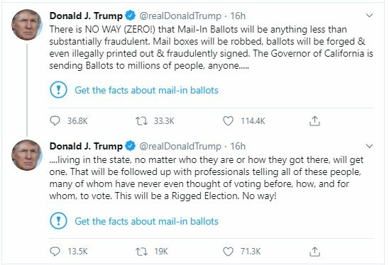 Πρόκειται για μία πρωτοφανή κίνηση από το Twitter, που τοποθέτησε μια ειδοποίηση καλώντας τους χρήστες να «ενημερωθούν για τα γεγονότα» σε μια ανάρτηση του Αμερικανού προέδρου Ντόναλντ Τραμπ σχετικά με τις επιστολικές ψήφους, στην οποία ο ένοικος του Λευκού Οίκου διατείνεται πως οι ψήφοι αυτές είναι «ουσιαστικά χαλκευμένες» και θα έχουν αποτέλεσμα «εκλογική νοθεία».
