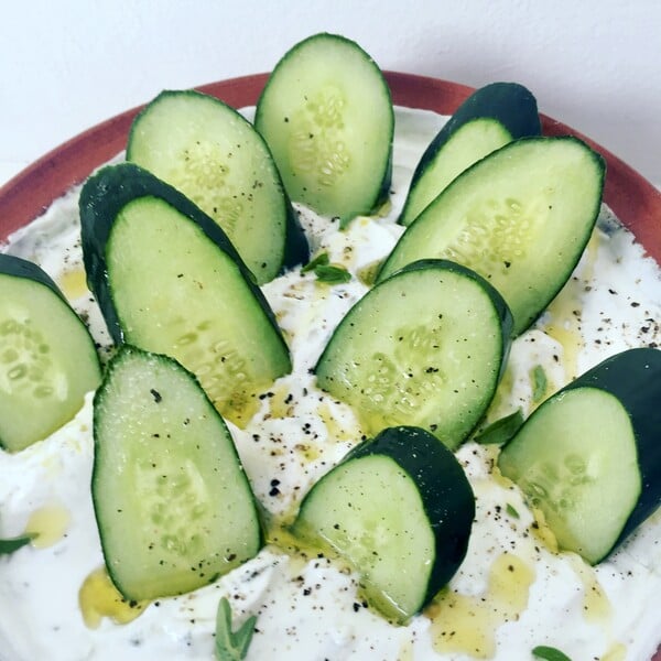 Πριν σερβίρουμε: Κόβουμε το αγγουράκι διαγώνια σε χονδρές φέτες και τις αλατίζουμε. Τις ραντίζουμε με λίγο ξίδι και ελαιόλαδο και τις βάζουμε στο τζατζίκι πλαγιαστά μέχρι να καλυφθούν ως τη μέση τους. Τρίβουμε λίγο ακόμα πιπέρι, ραντίζουμε με ελάχιστο ελαιόλαδο και σερβίρουμε.