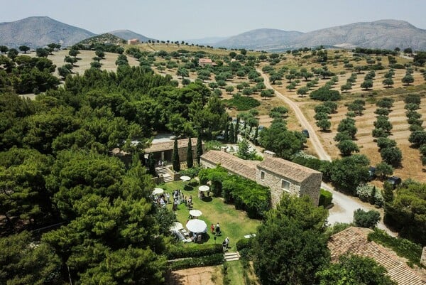 Το κτήμα βρίσκεται 40 λεπτά από την Αθήνα και αποτελείται από τρεις ξεχωριστές κατοικίες, δύο ξενώνες και ένα μικρό εκκλησάκι, όλα χωρισμένα από ιδιωτικούς κήπους και αίθρια.