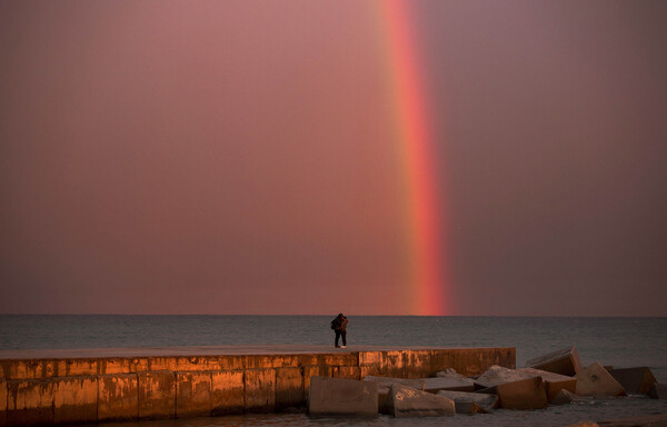Ένα ζευγάρι φιλιέται ενώ το ουράνιο τόξο εμφανίζεται μετά από την καταιγίδα στην Βαρκελώνη.