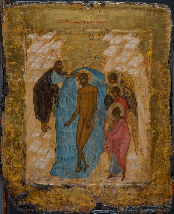 Η Βάπτιση του Χριστού. Νόβγκοροντ, 16ος αιώνας. Το επεισόδιο της Βάπτισης εικονίζεται ιδιαίτερα λιτό, με τα βασικά μόνο πρόσωπα της σκηνής, από τα οποία απουσιάζει το χέρι του Θεού και το άγιο Πνεύμα. Μουσείο Βυζαντινού Πολιτισμού Θεσσαλονίκης, αρ. ΒΕΙ 576