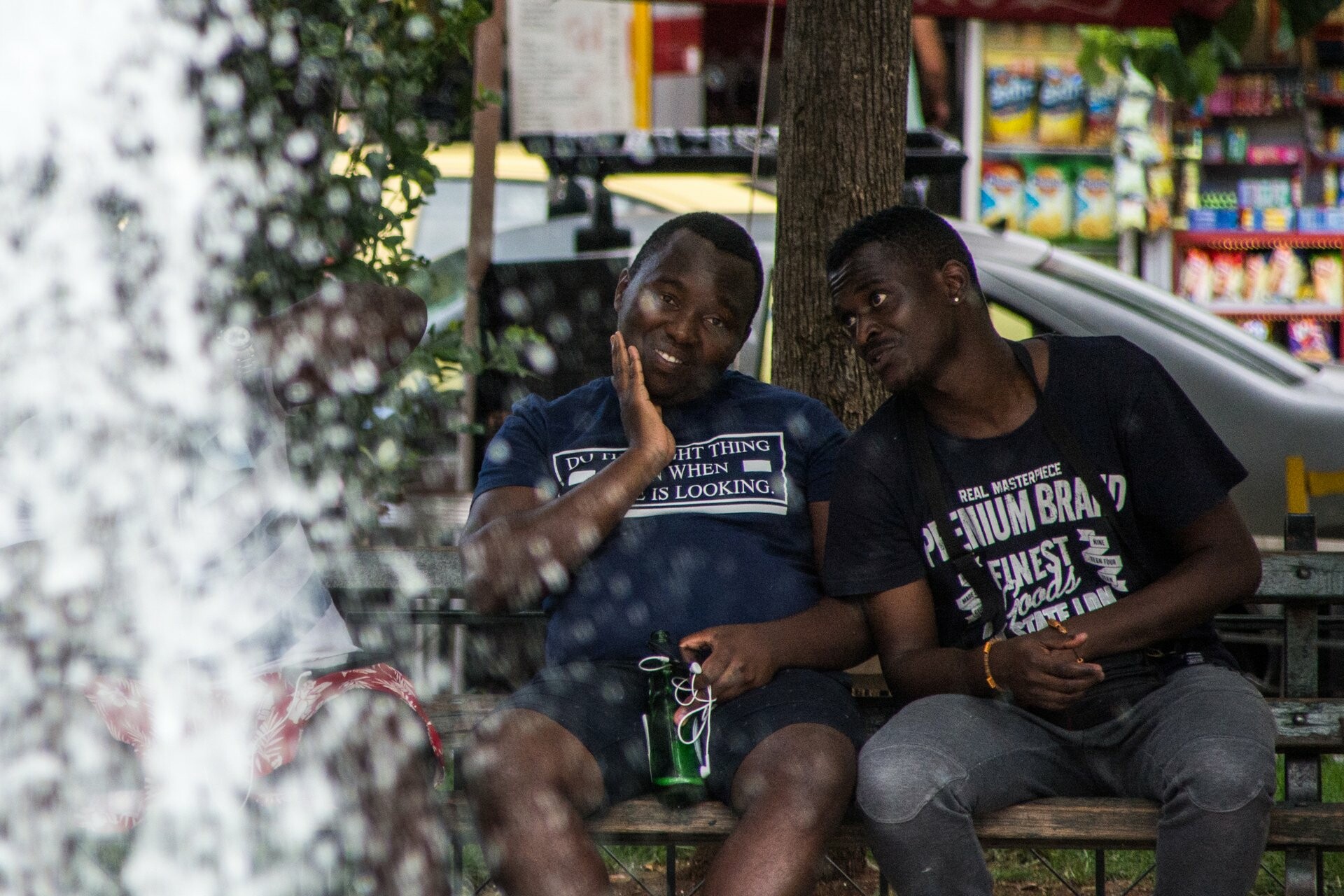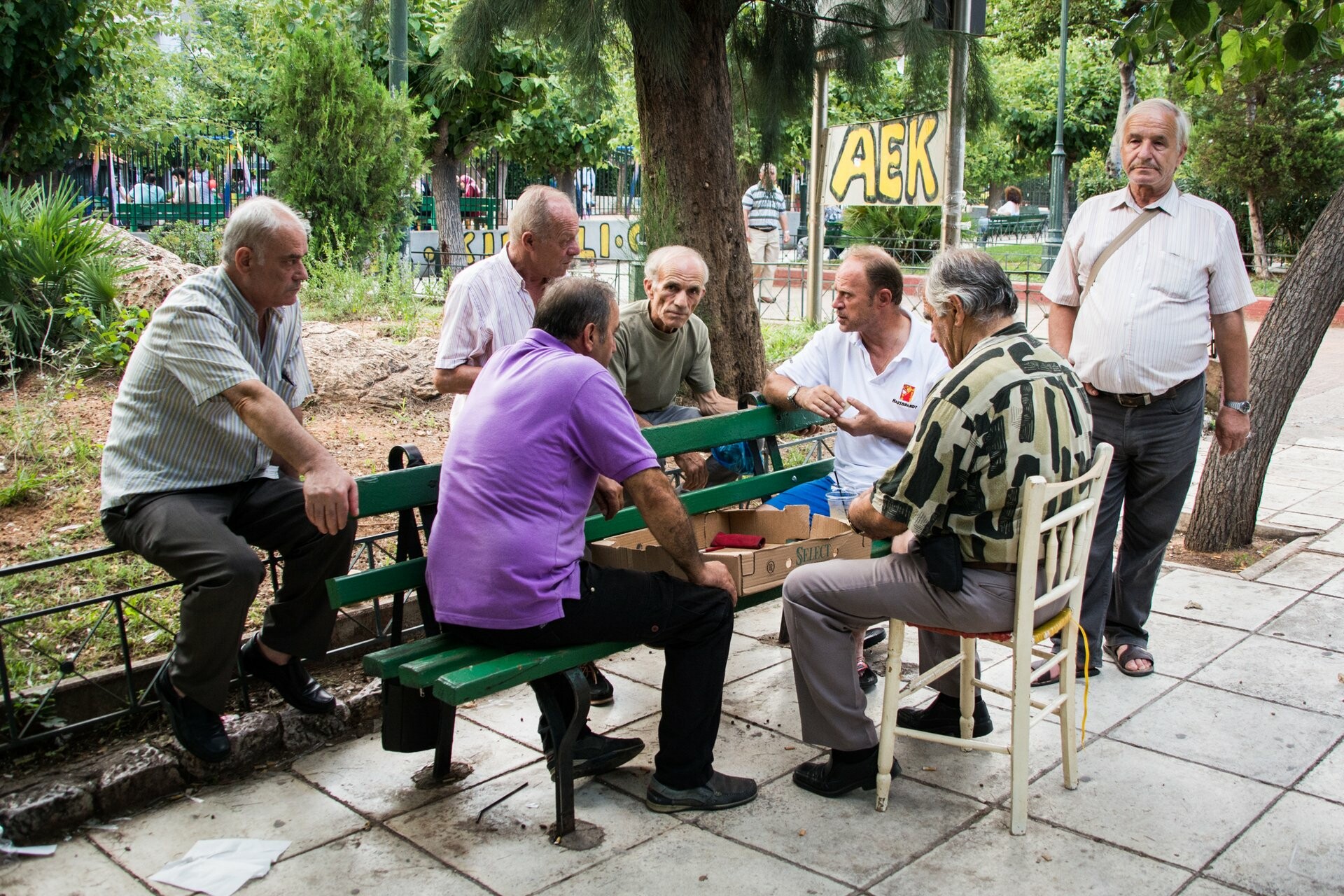 Εξακολουθεί να είναι, πάντως, μια ζωντανή πλατεία, με μικρά παιδιά να παίζουν μπάλα με τους γονείς τους, γιαγιάδες που κάνουν τα εγγόνια τους βόλτα με τα καροτσάκια, ανθρώπους που κάθονται στα παγκάκια (μιλώντας στα κινητά ή χαζεύοντας με αυτά), ζευγάρια που χαίρονται την καλοκαιρινή ραστώνη, πλανώδιους που πουλάνε από παιχνίδια μέχρι πλαστικά μπιμπελό και κινητά, και άπειρα σκυλιά κάθε ράτσας και μεγέθους, με τους ιδιοκτήτες τους (Ο Φ. θεωρεί ότι τα πιο πολλά σκυλιά και οι ιδιοκτήτες τους μοιάζουν εξωτερικά και εσωτερικά).