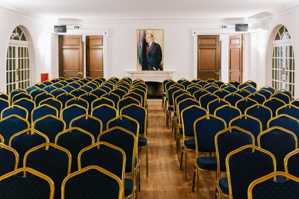 Στο ισόγειο βλέπουμε σήμερα το μεγάλο σαλόνι που έχει μετατραπεί σε χώρο ομιλιών, το Καφέ Δωμάτιο με το τζάκι και τις πολυάριθμες εγκυκλοπαίδειες ,καθώς και την τεράστια κουζίνα με τις δύο εισόδους.