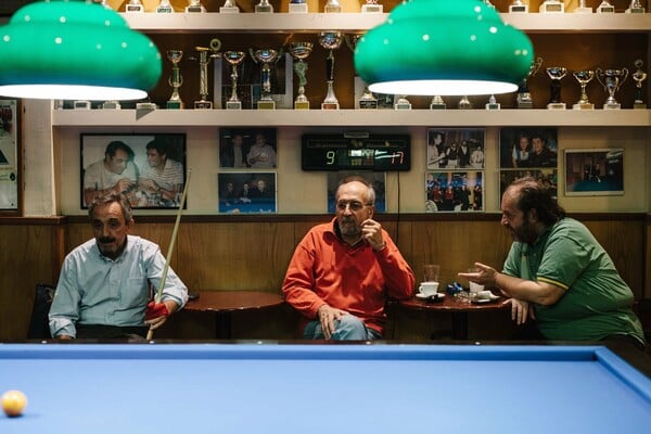 Στο χαλάκι που έχει στην εξώπορτα το υπόγειο μπιλιαρδάδικο «Roi Mat», στην πλατεία Αμερικής, υπάρχει πεσμένο ένα δέκα σπαθί. Η πινακίδα γράφει «Roi Mat 1974» και κατεβαίνοντας τις σκάλες, οι ρομαντικοί σίγουρα φαντάζονται τις πιένες που γνώρισε ο χώρος τις περασμένες δεκαετίες. Κάτι από '70s θυμίζουν μόνο τα πτυσσόμενα δερμάτινα καθίσματα του Roi Mat και οι υπεράριθμες φωτογραφίες (και εδώ) με διάσημους που έχουν κάνει το πέρασμά τους από το μπιλιαρδάδικο, το οποίο έχει τη μυσταγωγική ατμόσφαιρα ενός καταφύγιου. Δεξιά της εισόδου υπάρχει μια μεγάλη κορνίζα. Στη φωτογραφία φαίνεται ο Μίκης Θεοδωράκης, έτοιμος να ρίξει μια στεκιά. Δίπλα του ο Σταμάτης Κόκοτας τον εμψυχώνει, με το βλέμμα στην μπάλα, ο Βασίλης Παπακωνσταντίνου αγωνιά για την έκβαση της κίνησης, ενώ η Μαρία Δημητριάδη παρακολουθεί με ήρεμη έκφραση την τριανδρία που κάποτε πέρασε από το μαγαζί. Καθώς φαίνεται, οι μεγάλοι ερμηνευτές και συνθέτες τιμούσαν τα μπιλιαρδάδικα.