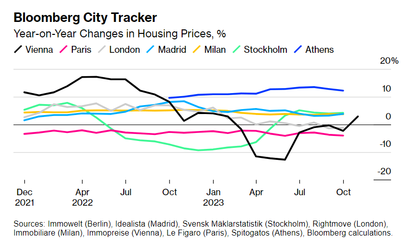 Ενώ το τέλος της εποχής του φθηνού χρήματος έχει πλήξει την αγοραστική δύναμη σε όλη την Ευρώπη, η έλλειψη κατοικιών αποτελεί συχνό φαινόμενο σε περισσότερες πόλεις. Στο Λονδίνο, το Παρίσι και το Βερολίνο καταγράφηκαν μειώσεις στα τελευταία μηνιαία στοιχεία τους σε σύγκριση με πέρυσι, αλλά ο κύριος όγκος των αγορών που παρακολουθείται από το Bloomberg City Tracker σημειώνει άνοδο, με το Μιλάνο, τη Μαδρίτη και τη Στοκχόλμη να καταγράφουν αυξήσεις άνω του 3%.