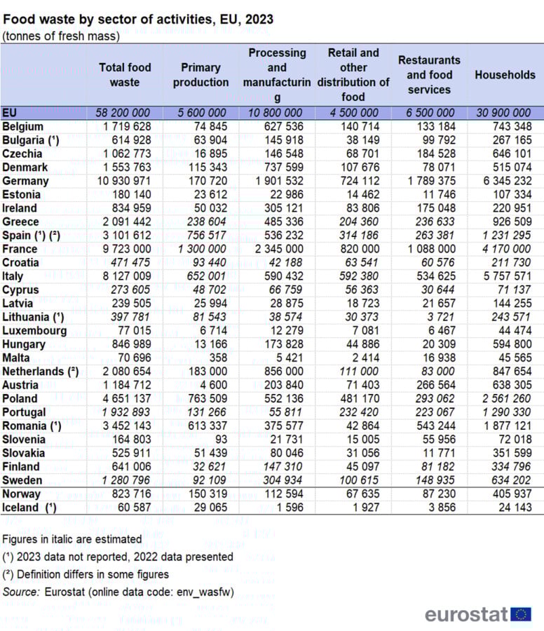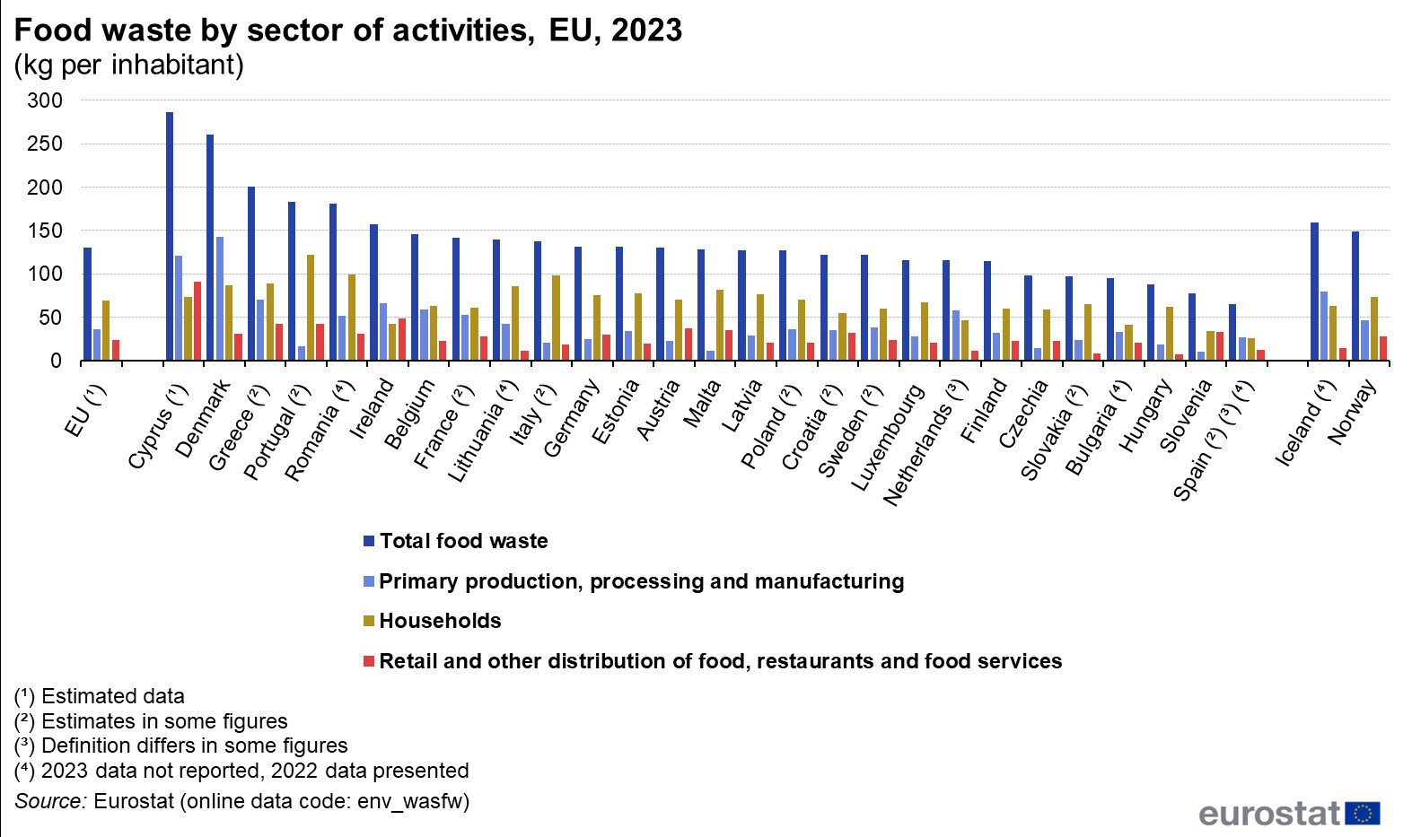 Συγκεκριμένα, για το 2023 η Ελλάδα σπατάλησε 2,09 τόνους φαγητού, το οποίο αντιστοιχεί σε 201 κιλά ανά κάτοικο, η τρίτη χειρότερη επίδοση εντός της Ευρωπαϊκής Ένωσης μετά την Κύπρο και τη Δανία.