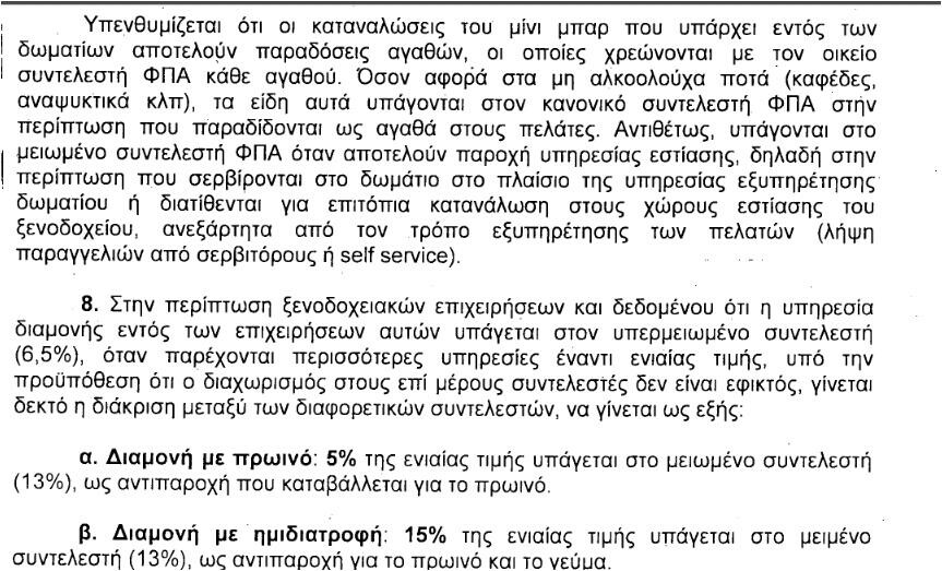 Στη δημοσιότητα δόθηκε η εγκύκλιος του υπ. Οικονομικών με το μειωμένο ΦΠΑ 13% που θα ισχύσει από την 1η Αυγούστου. Όπως φαίνεται από τις διατάξεις της εγκυκλίου, ο ΦΠΑ μειώνεται από 23% σε 13% στην εκμετάλλευση καφενείων, καφετεριών, ζαχαροπλαστείων, εστιατορίων, ψητοπωλείων, οινομαγειρείων και λοιπών συναφών επιχειρήσεων. Στο 23% παραμένει ο φόρος για delivery μη αλκοολούχων ποτών.
